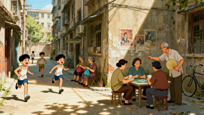 (背景音:老旧小巷里,斑驳墙皮、青石板路,纸牌 “哗啦哗啦” 翻动声,掺杂着偶尔的蝉鸣 )