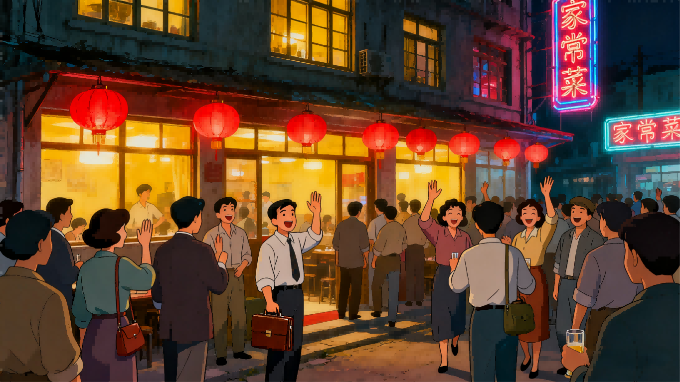 (背景音:饭馆里的喧闹声渐起,杯盏碰撞的清脆声、划拳的吆喝声、夹菜的 “簌簌” 声交织在一起)