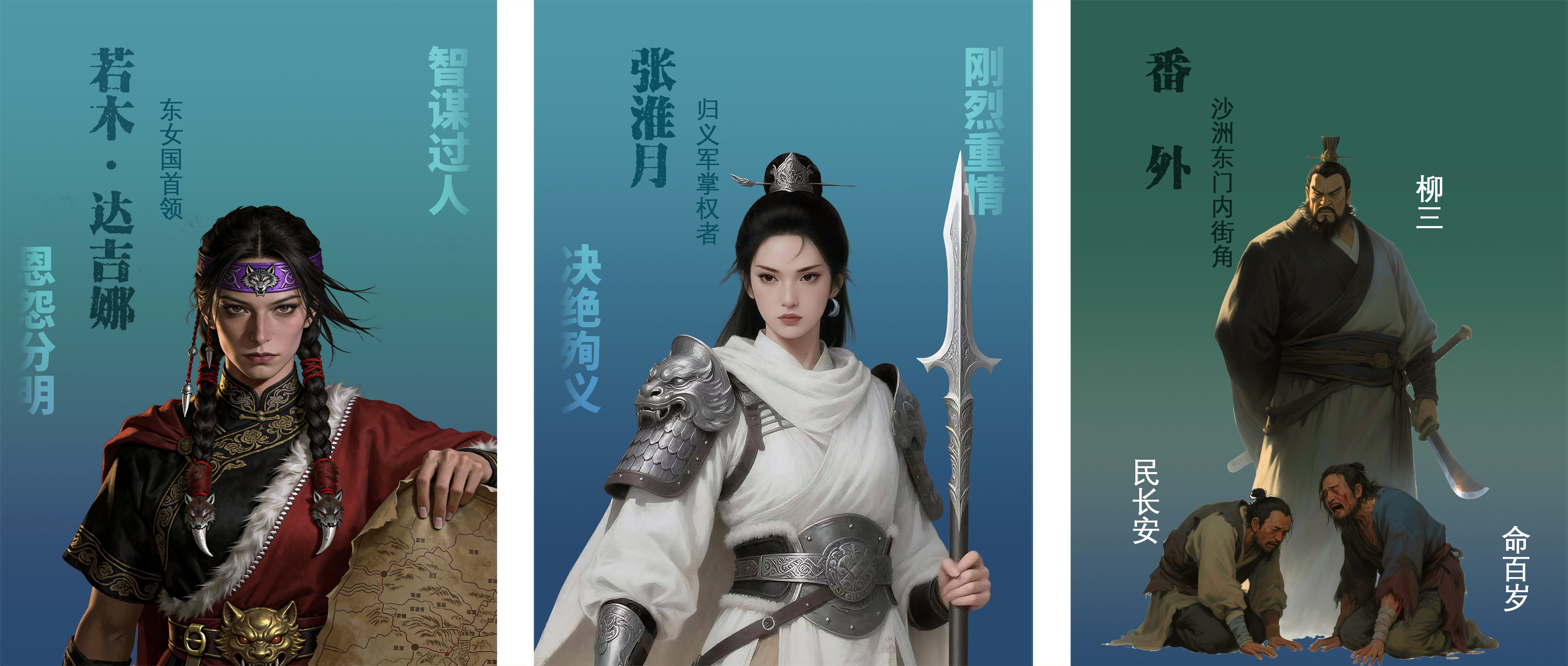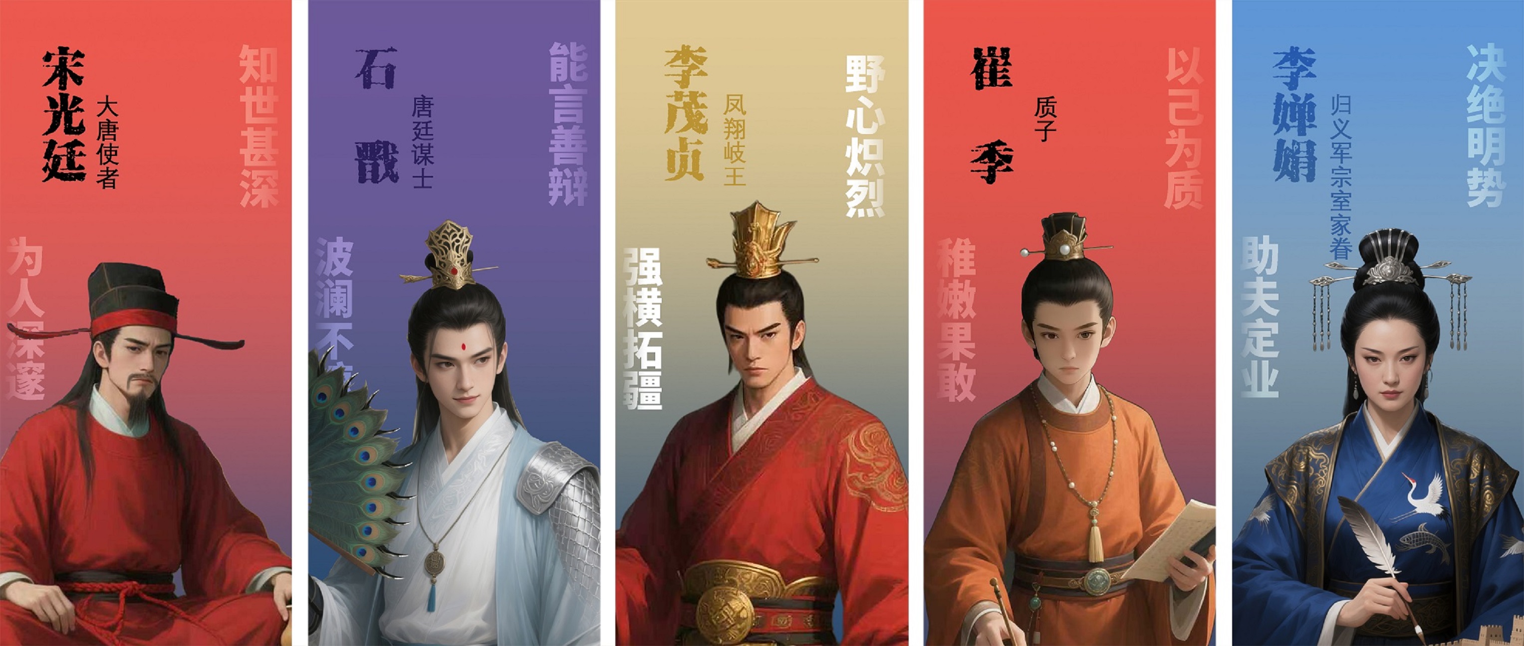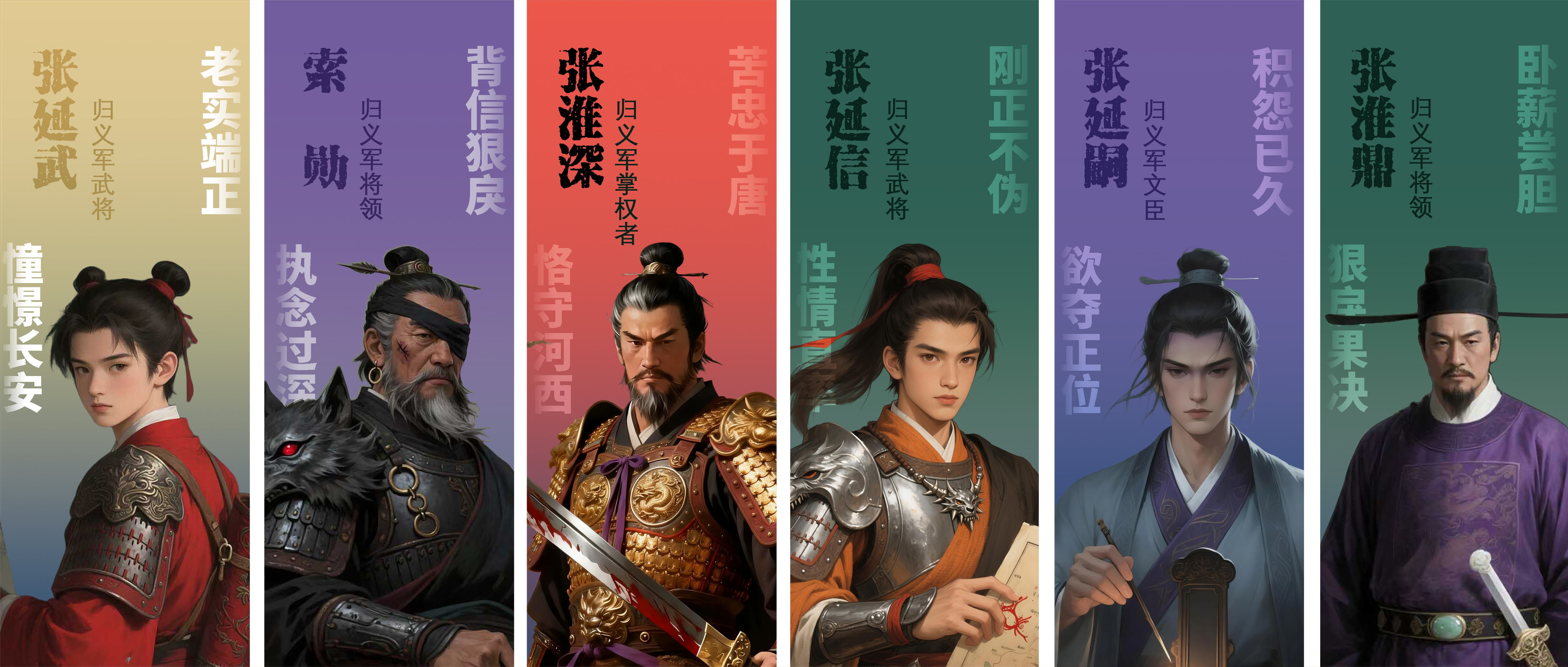 张淮鼎:归义军将领,中壮年左右。卧薪尝胆,狠戾果决,奋力挣脱傀儡命运的枭雄。