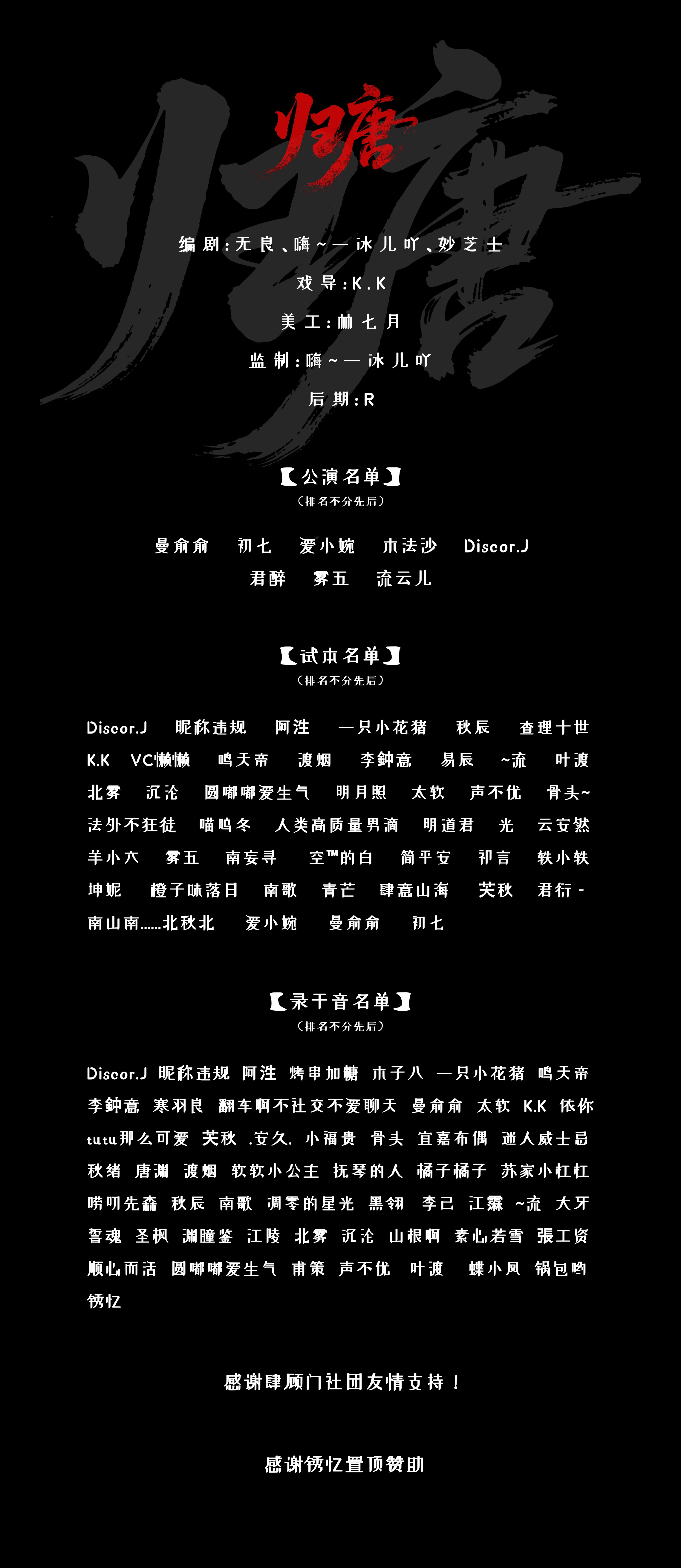 欢迎演绎由闲野山、幕后剧社联合出品,無良、一冰儿、妙芝士编著,K.K、林七月、 R 等共创,大型群像历史普本《归唐》。