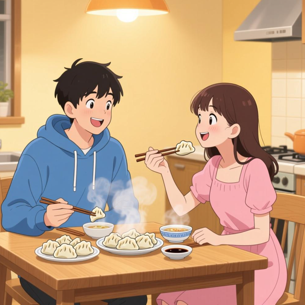 天昊:(边吃边说)哇哦,老婆,今天这饺子真好吃!