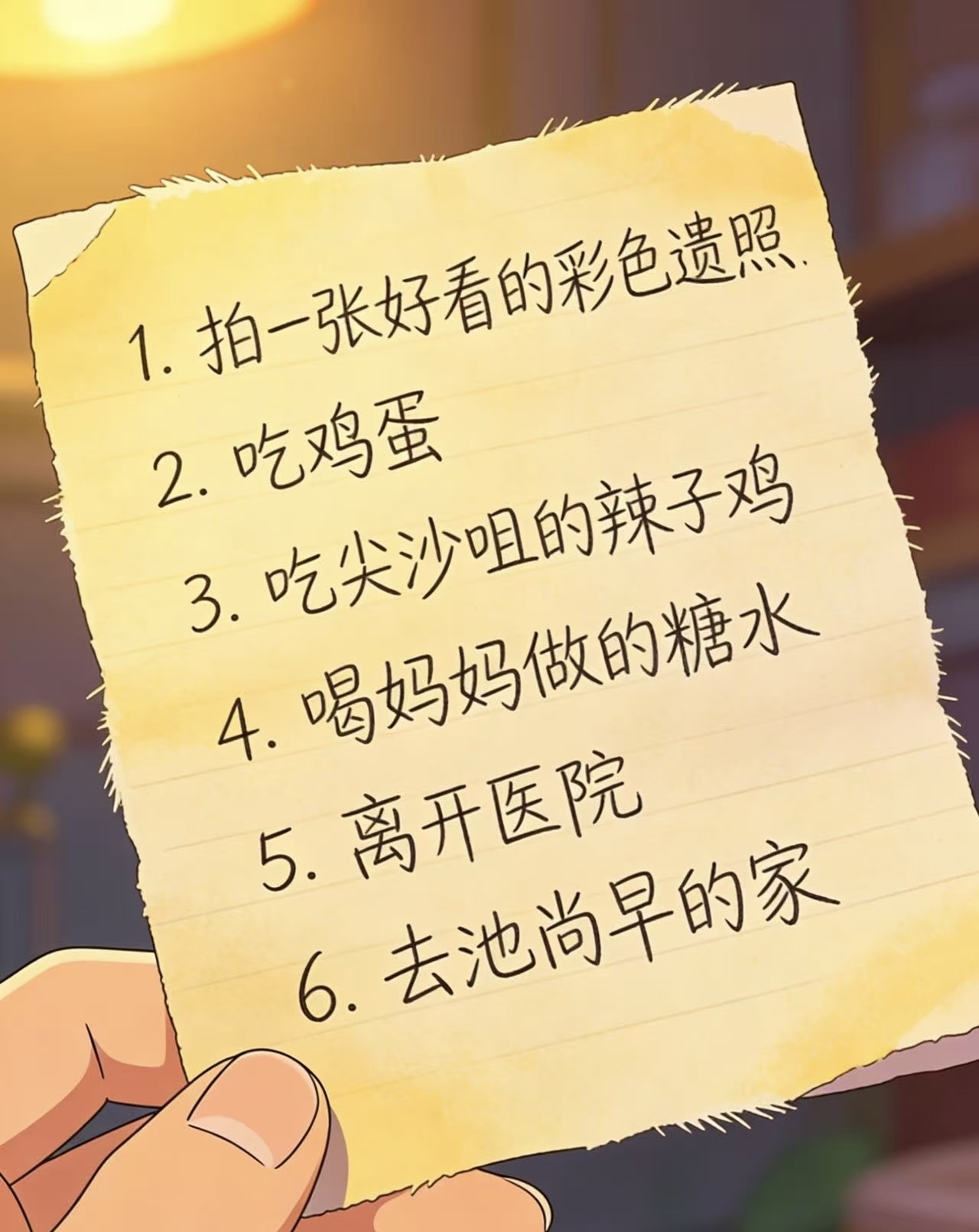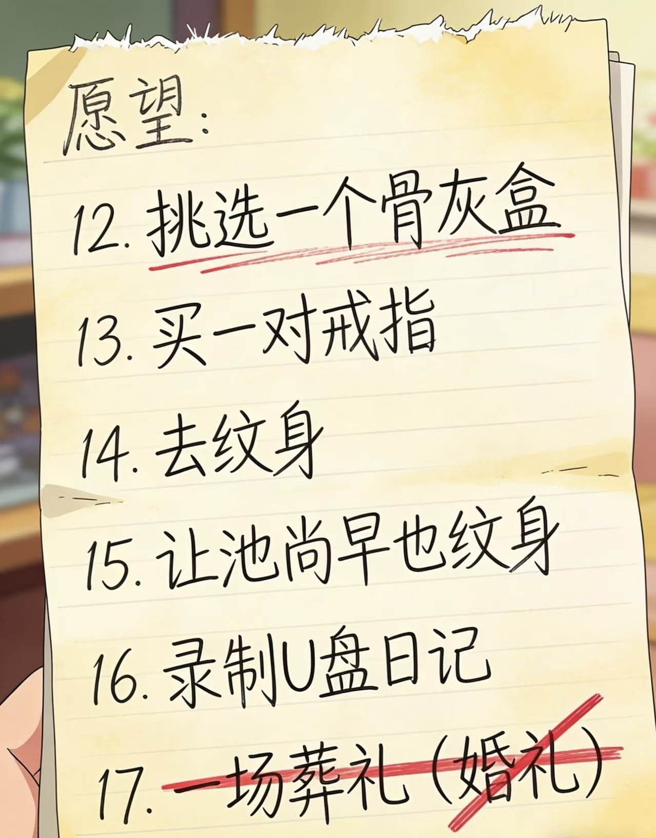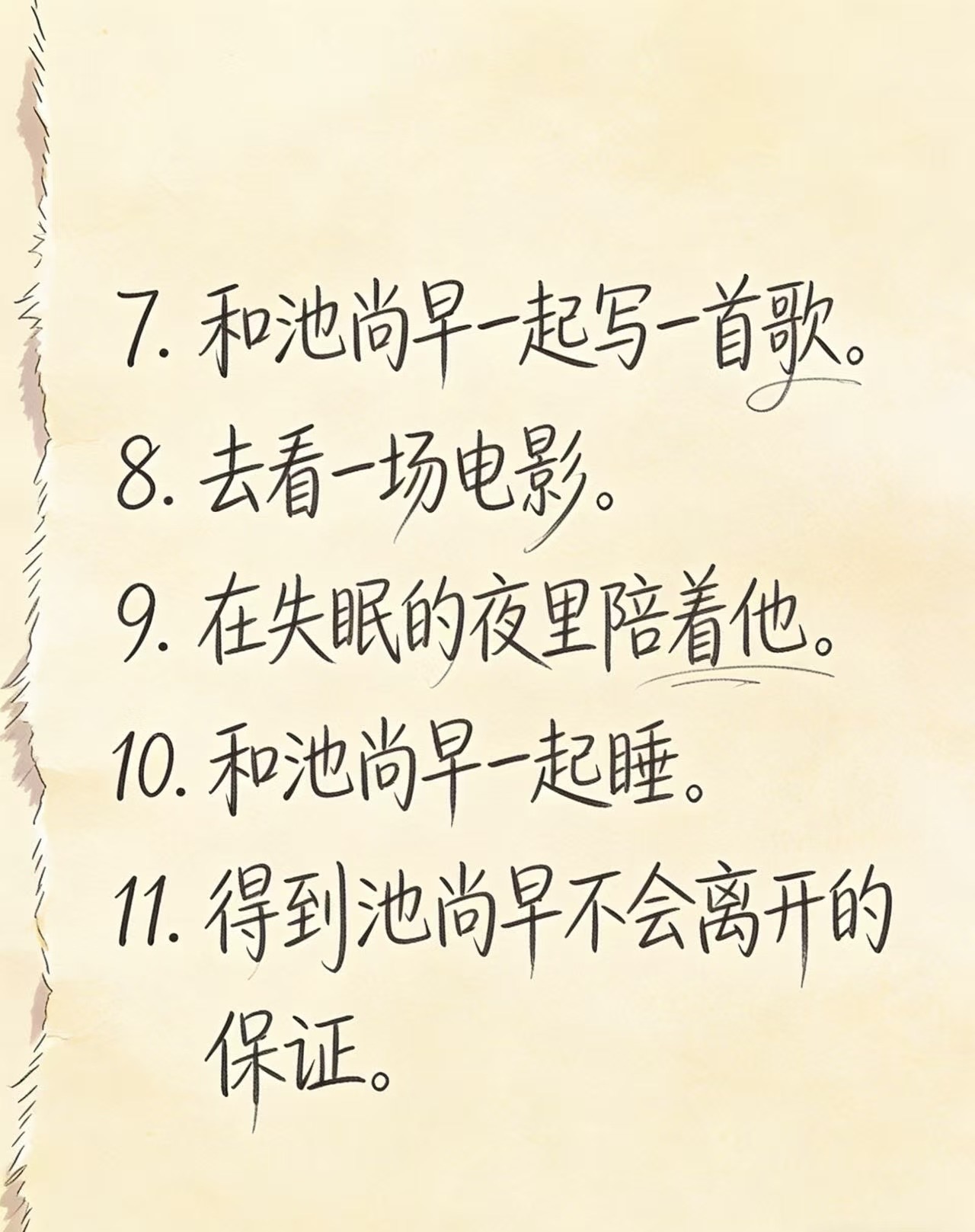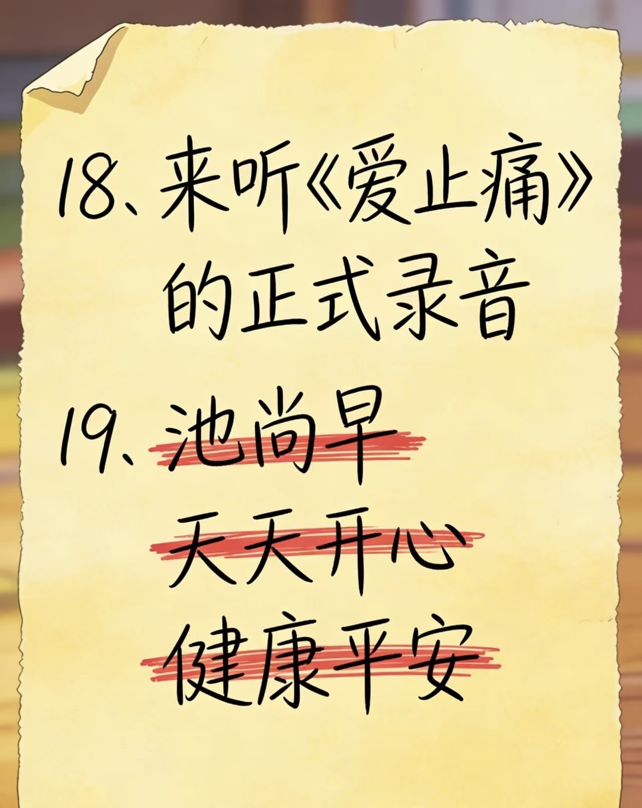 池尚早:我过来,是看看你死了没有。要是死了,我就把你的尸体偷出去,做成标本摆在排练室里。这样以后写不出歌的时候,还能看看你,找找灵感。既然没死,那就还有点用。我给你列了个单子,都是些死前必须干的破事。省得到时候你有什么遗愿,还得托梦给我,麻烦。