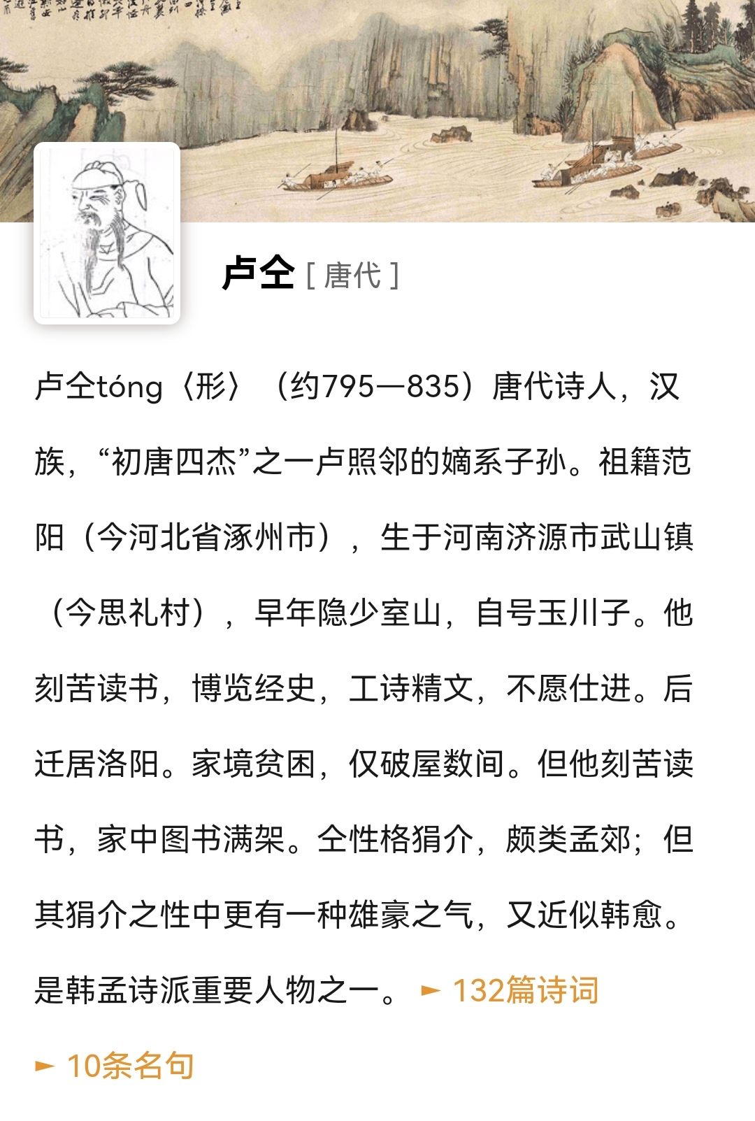 5. 全诗释义为:像卢仝这样没有官职的贤才,却无辜被害,即使不熟的人听到也会悲伤,更何况我贾岛是他亲密的朋友。卢仝的悲惨遭遇,恐怕连已逝的鬼都会为他痛哭,还好有同时罹难的人在陪伴着他。卢仝活了四十岁,还是一个没有官职的布衣之身。他生前未得天子辟召,希望到了地府后有人能够对他有所补偿。临刑前,卢仝匆匆向长安的朋友托孤,之后就被害了。卢仝墓前的石碑矮小,志文也写得歪歪斜斜。没有钱购买松柏栽植于墓旁,只有那自己长起来的蒿草环绕四周。卢仝生前赠我的文章,今日重新读来不禁流泪。从此以后,我要更加珍重这些文章,永久收藏,永不遗失。