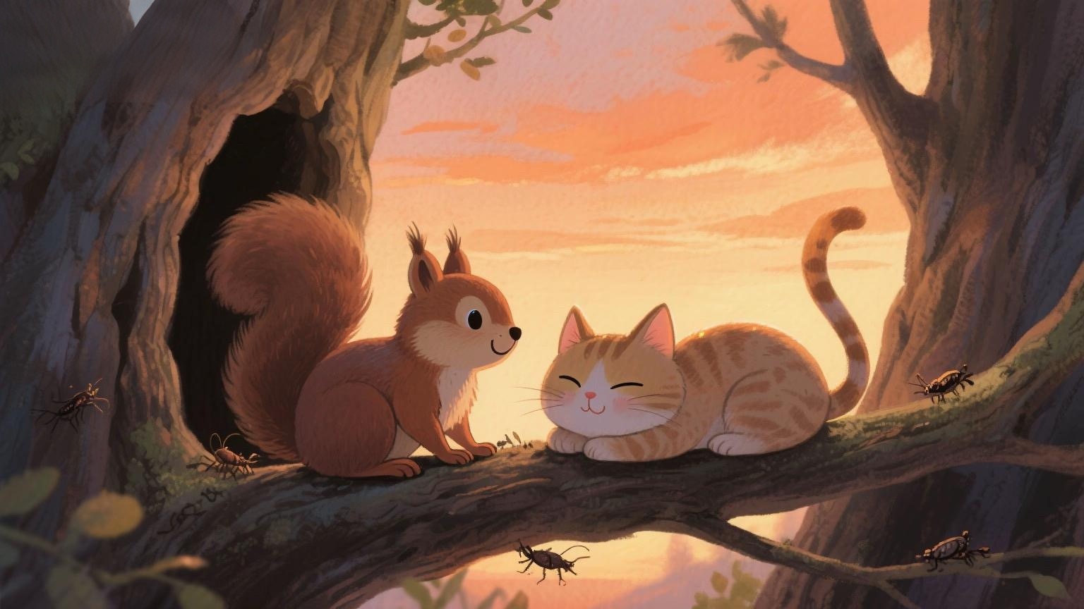 小猫:……喵。睡吧,小松鼠朋友。明天太阳公公会叫醒我们的。……