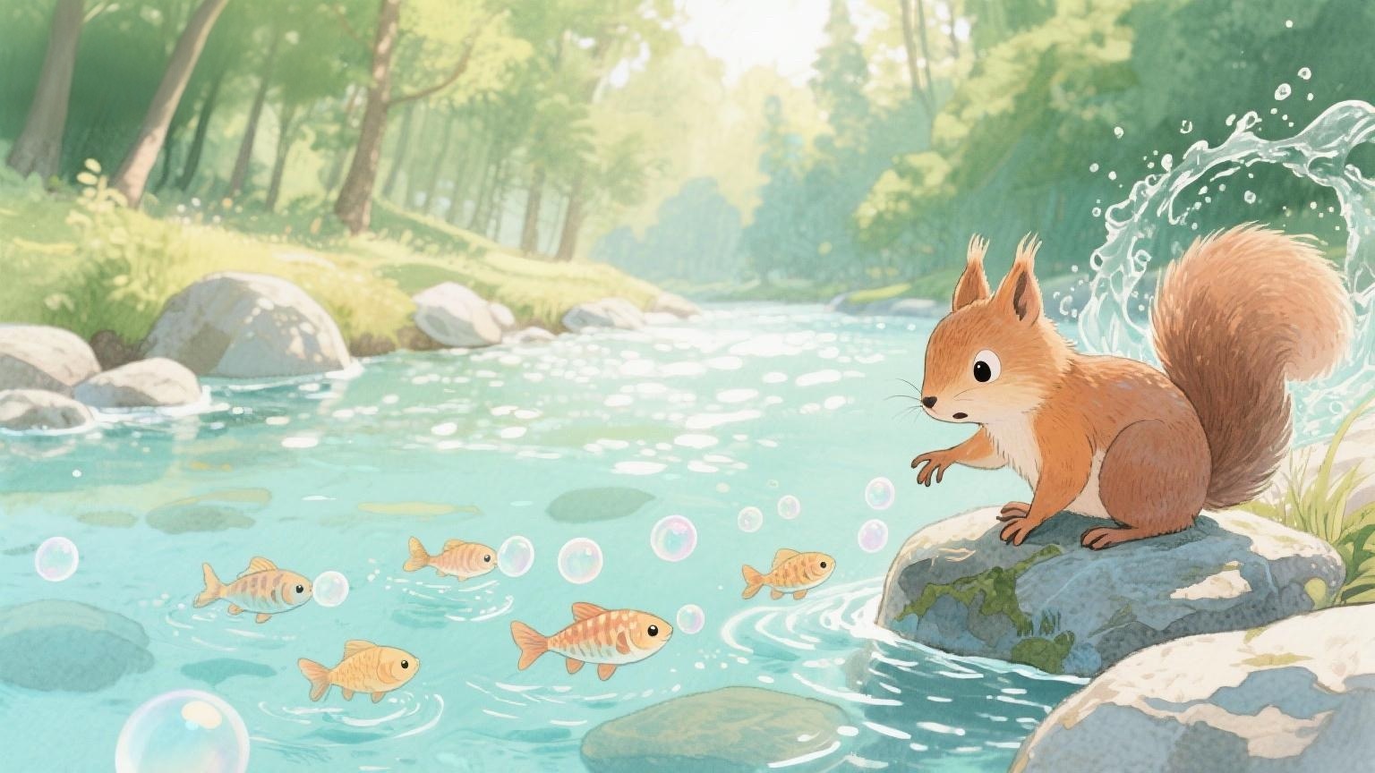小松鼠:哇,看呀!水里有亮闪闪的东西在跳舞!是小鱼!好多条小鱼!
