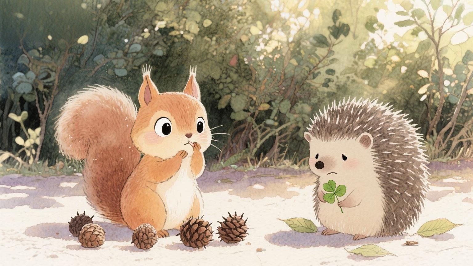 小松鼠:(自言自语)唔,唔,今天也许能找到朋友?没有尖尖刺的,不用待在水里的,不嫌我灰扑扑的,会有的吧?