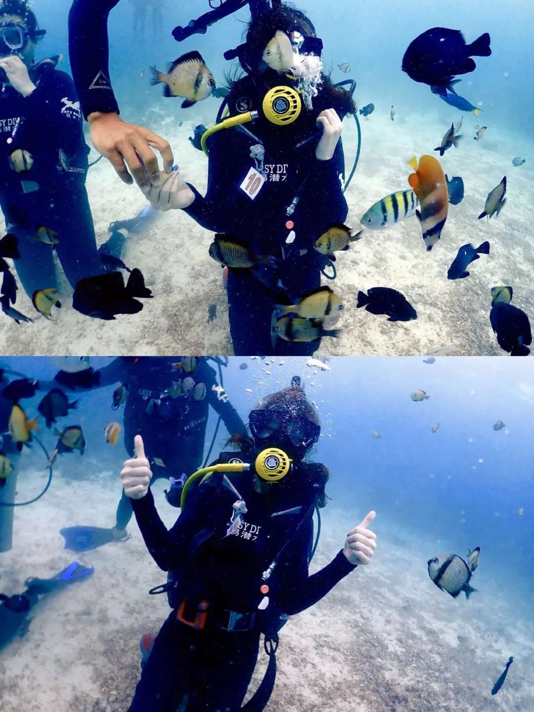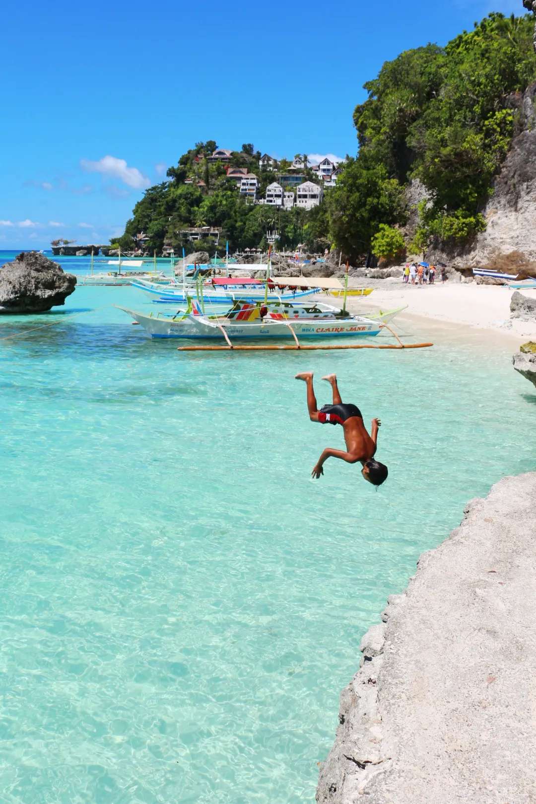 水晶岛如其名,海水晶莹透亮;鳄鱼岛玩浮潜;水牛岛和魔术岛都是玩悬崖跳水,后者是陈意涵30岁生日时与闺蜜张钧甯一起跳崖的地方。一个个从悬崖边伸出的竹子或木板就是跳台,高度从3-10米不等,可以任选高度。