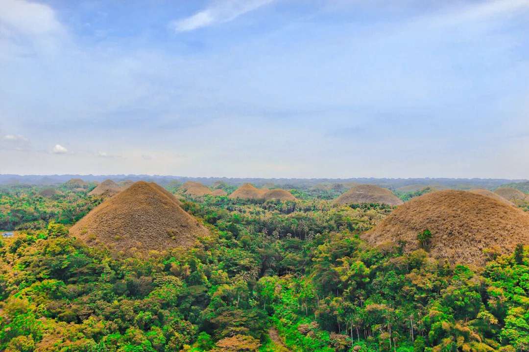 在薄荷岛的中部,千余座圆锥形状的小山波澜起伏,像一排排巧克力堆放在大地上,因为被当地人形象的称为“巧克力山”。