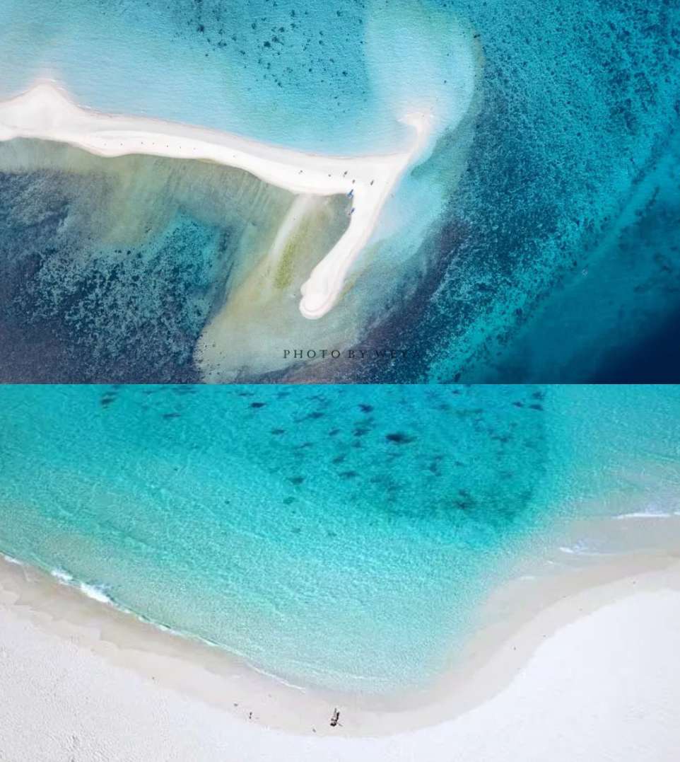 白岛距甘米银岛仅几百米,是一片无人、无树、无建筑的拖尾沙洲,它的形状一直在变,一些人看到的是S型,一些人看到的是L型,航拍非常好看。