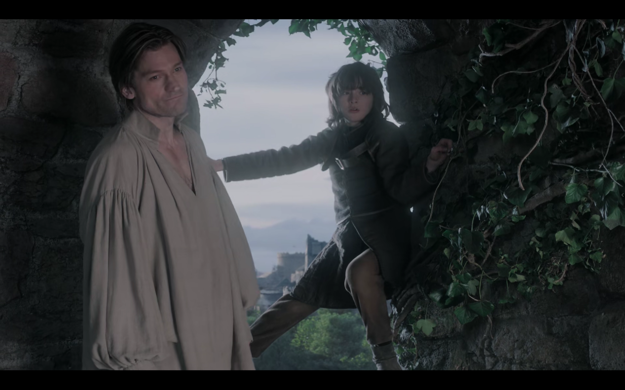 场景:布兰带着小狼送别了父亲,然后趁着父亲不在开启了自己的古塔攀爬大冒险。之后,在塔顶目睹了同样趁劳勃不在野合的兰尼斯特兄妹。