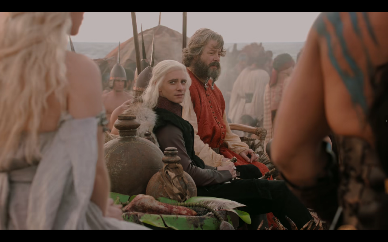 场景:卓戈卡奥即将与丹妮莉丝完婚,韦赛里斯和伊利里欧坐在多斯拉克人中,格格不入。