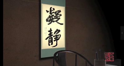这幅大字行书凝静中堂,是沈尹默1963年为其养子褚家立所书。写这幅字时,年逾八旬的沈尹墨双目几乎全盲,然而在近乎失明的状态下,他的笔致却更显苍茫厚重。一气呵成的“凝静”两个字,既有北碑的舒展粗犷,又间米芾(fu2)的沉着痛快。点画墨丰骨劲,飞白空灵通畅,末笔更是聚足笔势如激流决堤,奔涌而出。