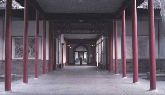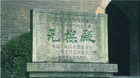 进入正门,是一条青石铺砌的甬道,甬道尽头矗立着一座高大的牌坊,牌坊前左右两侧各有一只石虎。祭堂利用原有的无梁殿改建,整座建筑采用砖砌拱券结构、不设木梁,这里看不到寸钉片木。它是中国同类结构建筑中规模最大的一座。