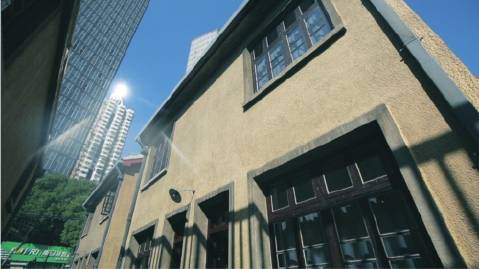 这是一座典型的民国时期建筑,青灰色外表更显冷峻硬朗。建筑立面是西方近代建筑常用的勒脚、墙身、檐部三段划分,而檐口和门窗却是传统的民族元素。在经历了80年风雨沧桑之后,它们仍然显示出独特的魅力。