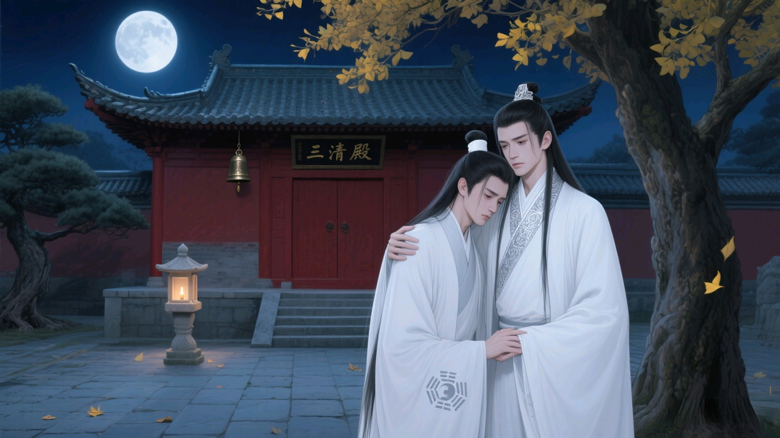 (藏经阁的檀香混着月光,暖着两颗乱了的道心)