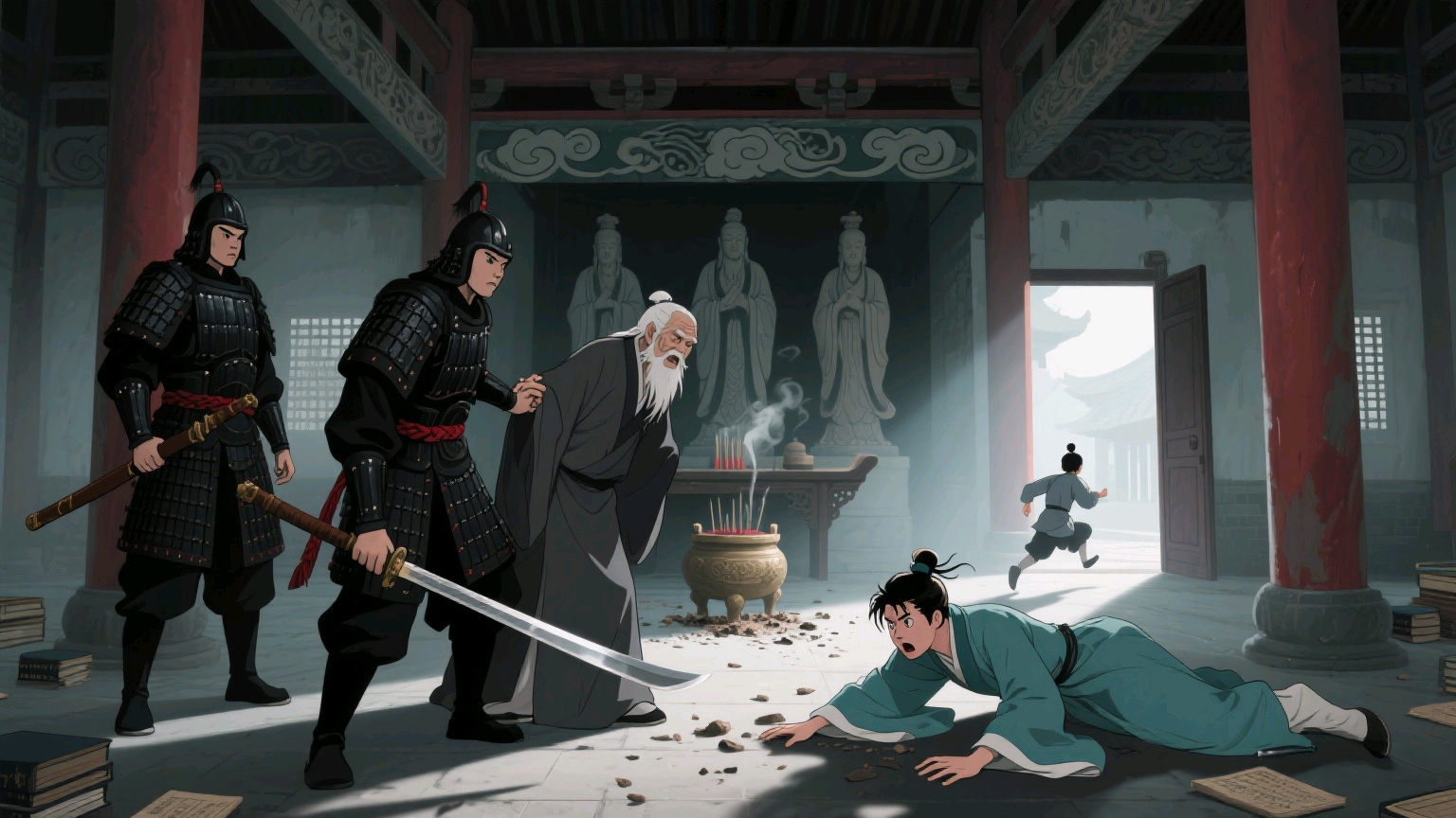 沈淮越:(从木梯下来,脚下一滑,经书散落一地)啊~