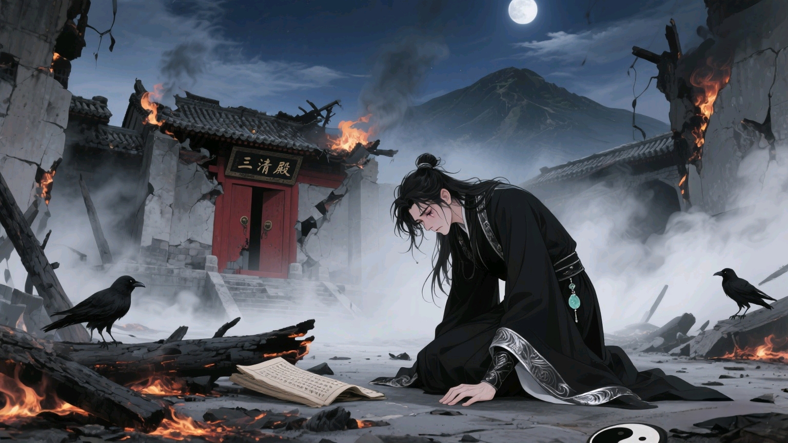 (苏砚之推开玄妙观大门,却看到一片残垣断壁,杂草丛生,他踉跄地走进废墟。)