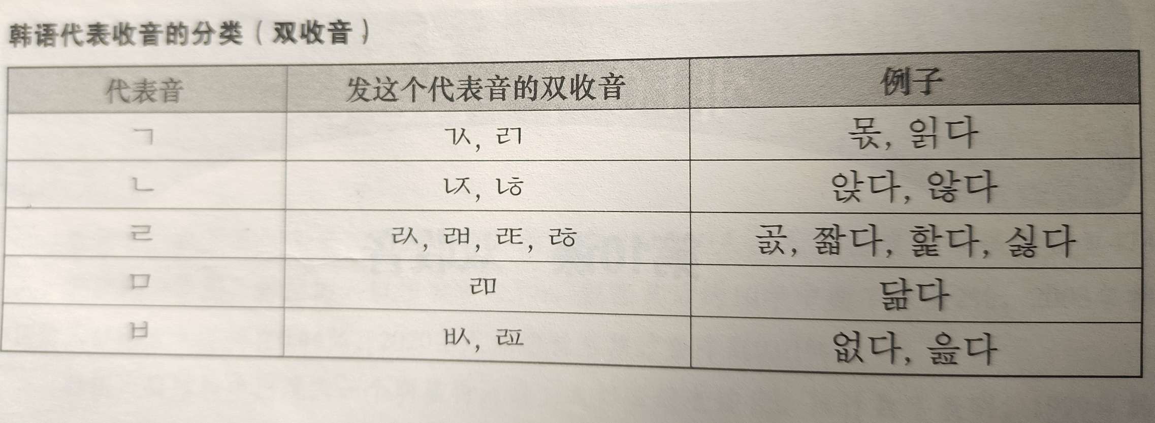 1.双收音“ㄱㅅ, ㅂㅅ, ㄴㅈ, ㄹㅅ, ㄹㅌ, ㄹㅂ, ㄴㅎ, ㄹㅎ”的发音