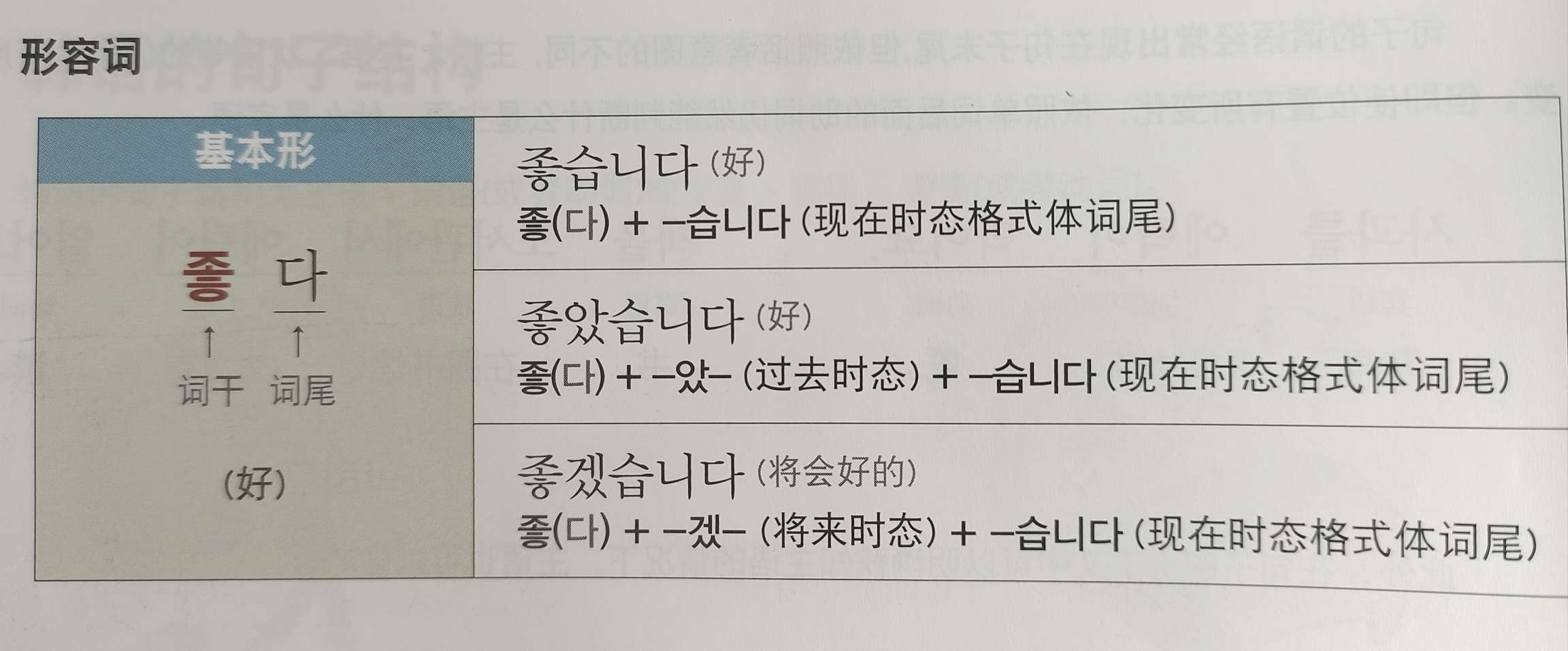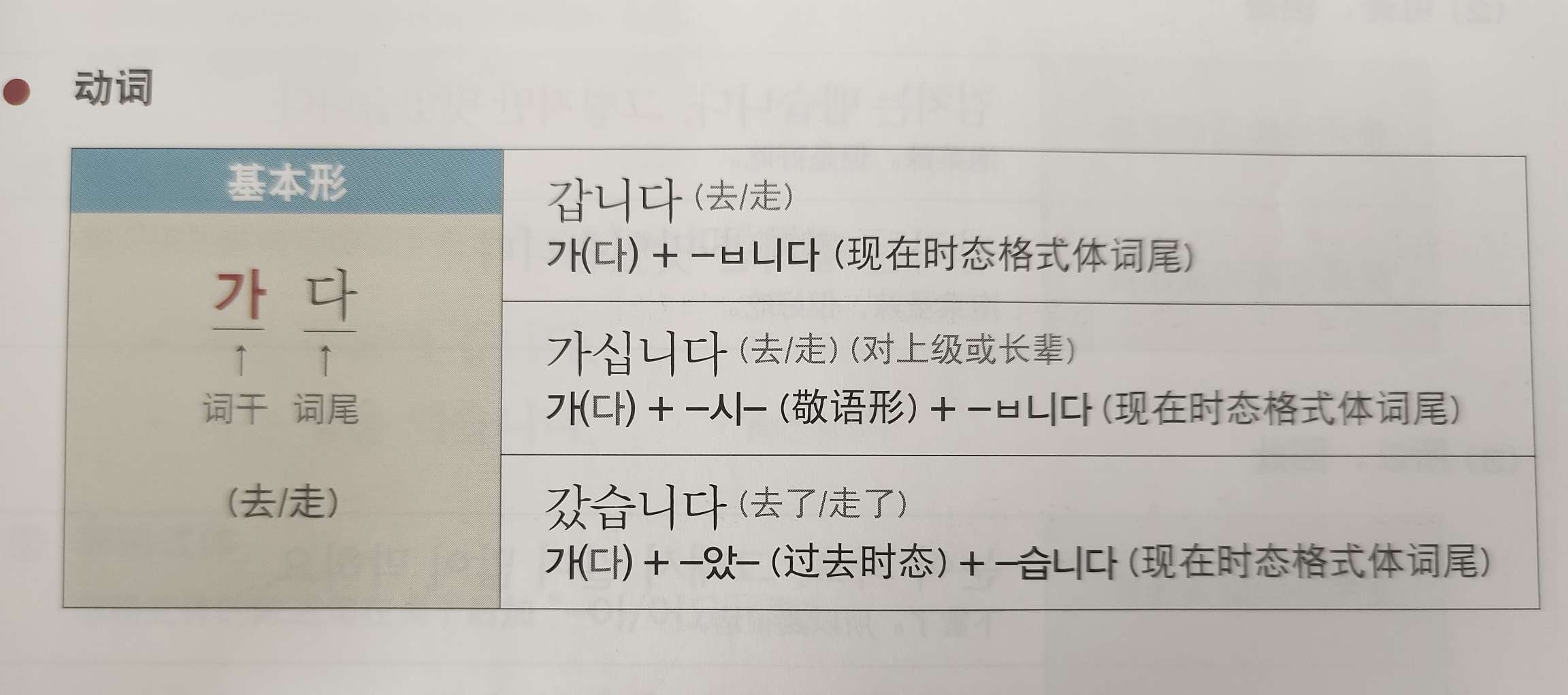 韩语中的动词和形容词具有根据时态,敬语表达,被动,使动以及语体而进行活用的特征。动词和形容词由词干和词尾组合而成,动词和形容词的基本形是在具备单词的意义的词干上添加“다”而成,也被称作“词典形”。因此,在查词典时,可以看到基本形是以“가다(去)”、“오다 (来)”、“먹다(吃)”、“입다(穿)”等的形态存在的。在活用时,词干不变,而将“다”去掉,在“다”的位置(动词词尾)上根据叙述者的意图添加为其他形态。