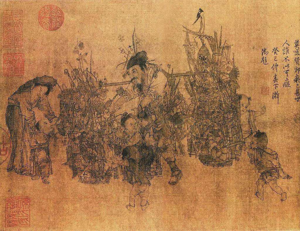 〔3〕宋代年画的发展离不开春节庆祝活动的丰富。风俗、仕女、娃娃等成为常见题材,时令图是代表之一:以孩童为主角的《秋庭戏婴图》,描绘商业情景的《货郎图》,以及刻画新春景象的《岁朝图》。得益于一批技艺精湛的民间画家,我们才能一窥宋代市民的生活场景。