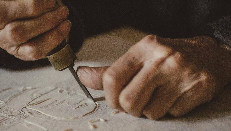〔18〕瞪眼看刻刀七十多年,杨洛书的视力和精力早已大不如前。到了晚上,光线强度不够,他只能让儿子杨福江接过刻刀赶工,试着在春节前将“土匪”创作的花加官门神制作出来。