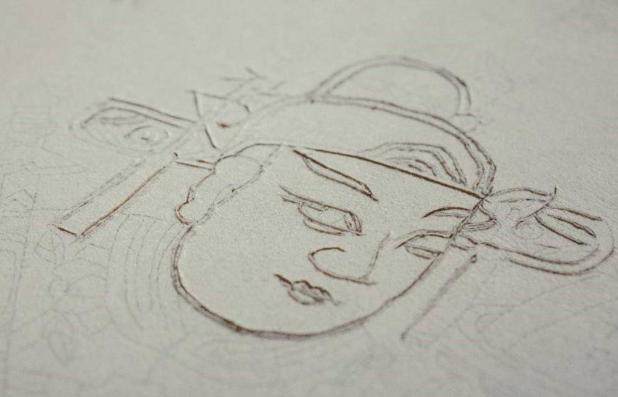 1.起稿画样。起稿画样是第一道工序,也是展现匠人创意灵思的重要步骤。匠人先要构思故事情节和画面结构,民间故事传说是重要题材。画工先以柳枝木炭条或香灰作画,这被称为“朽稿”。直至修订无误后,即可以此为基础完成正稿。正稿十分考验画工技艺,线条粗细、色彩明暗都直接影响最终效果。画稿完成后,就贴在木版上静待雕刻。