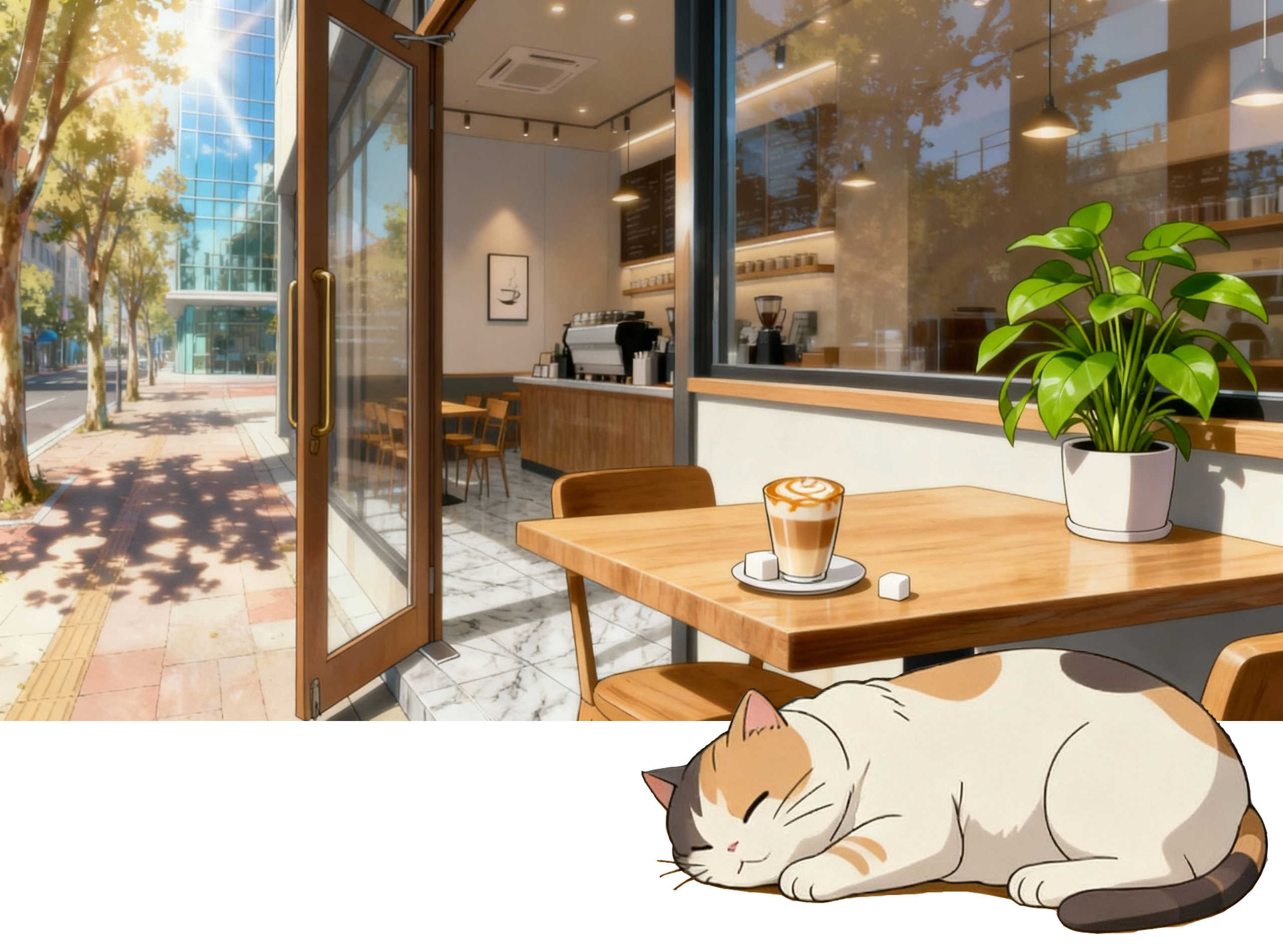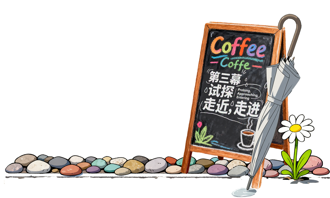 音效:舒缓的轻音乐,咖啡机运作声,低低的交谈声