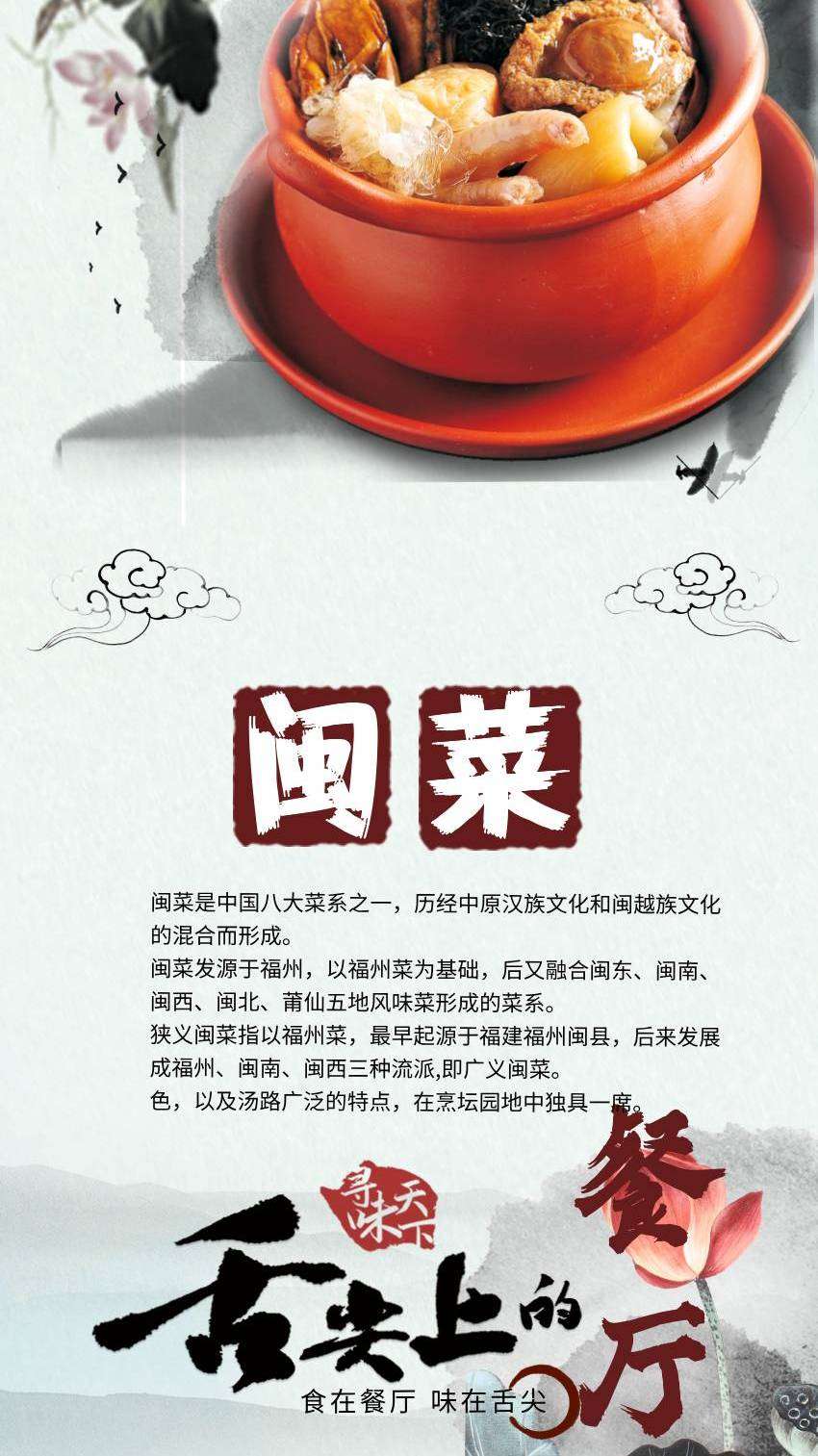 闽菜:(福建菜)以海鲜为主,口味清淡,注重汤的烹饪。