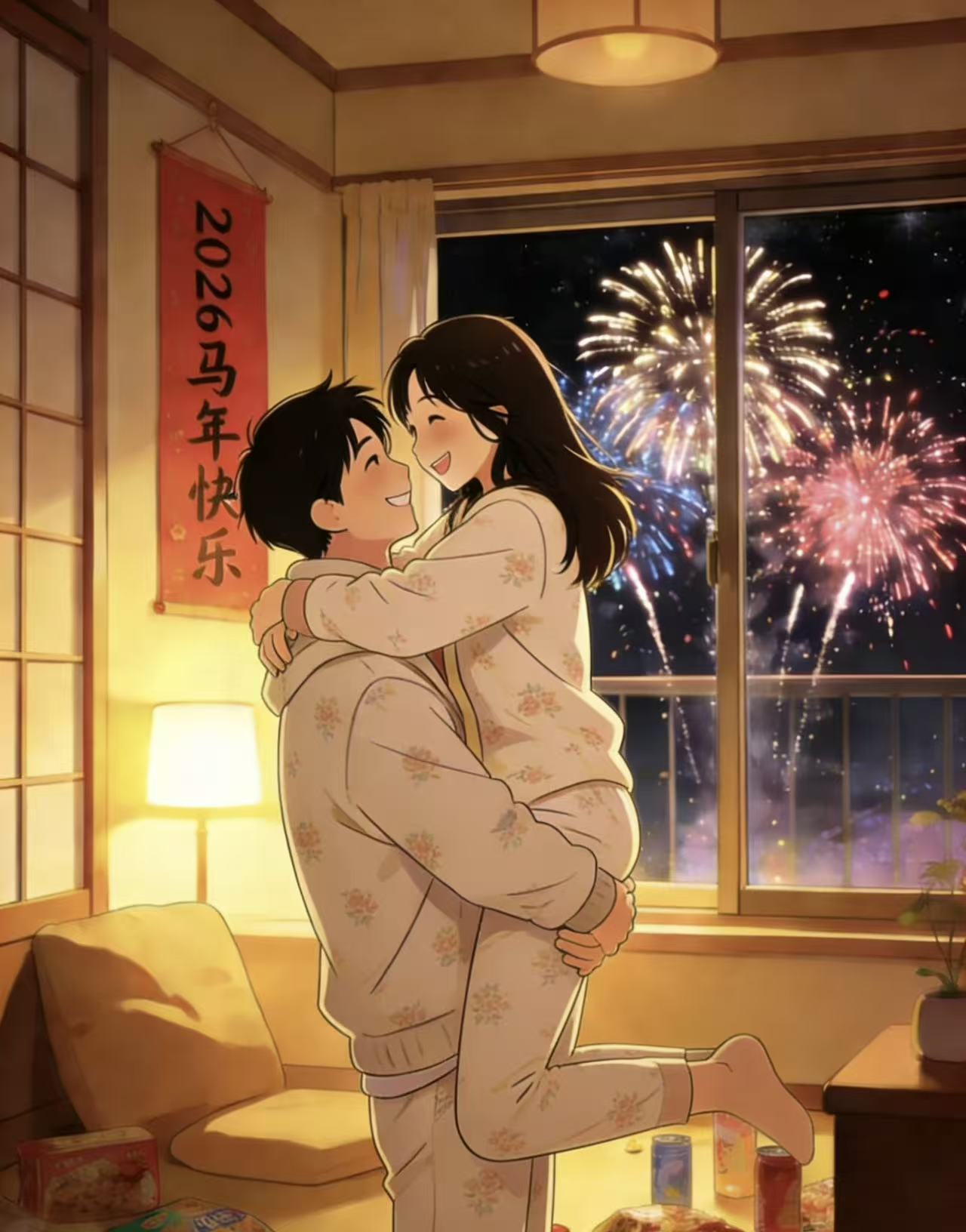 窗外烟花盛放璀璨绚烂,烟花结束,音乐起入词