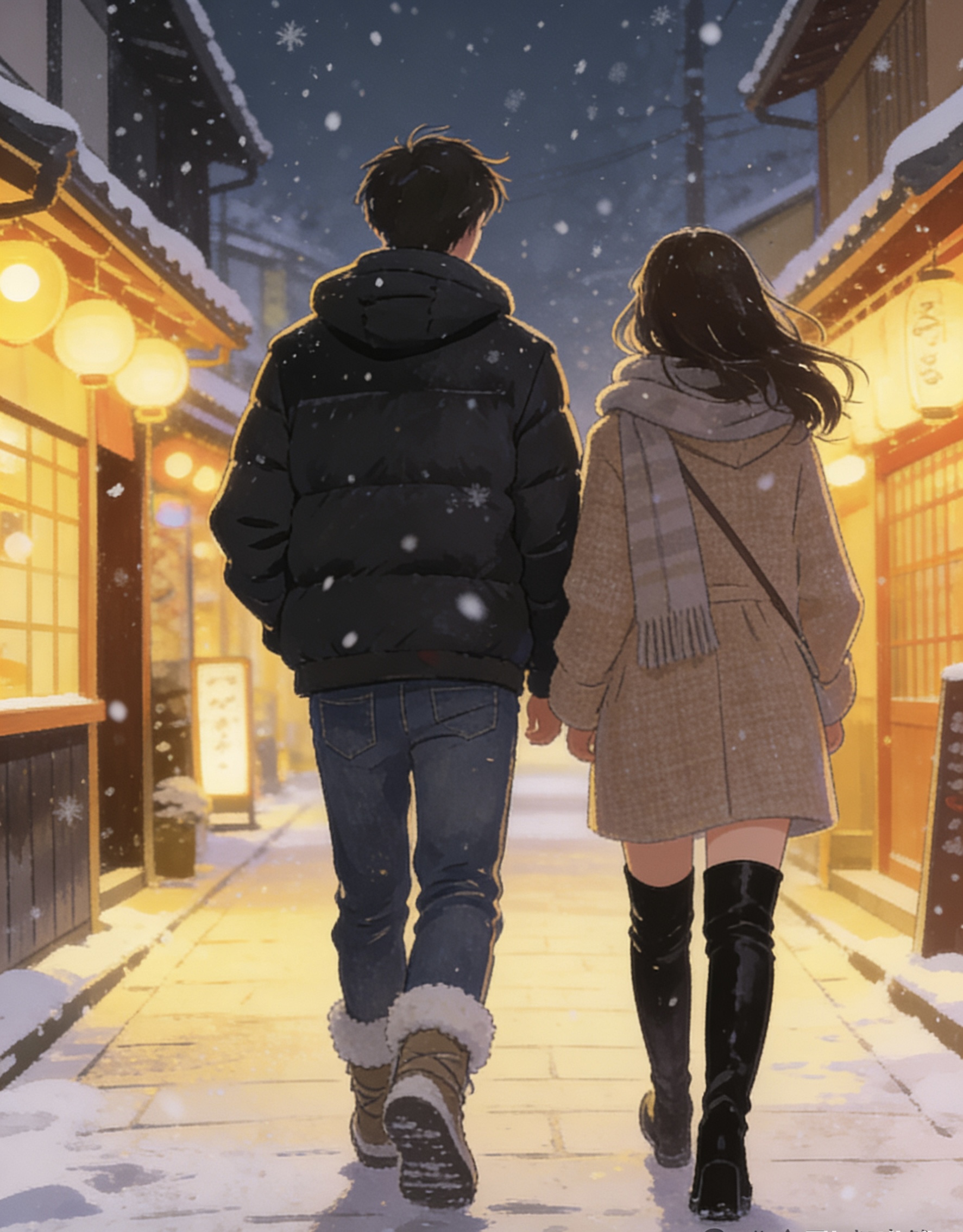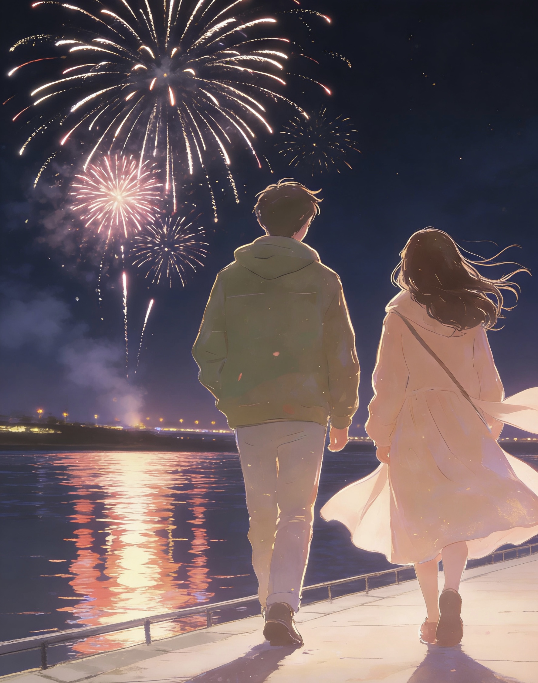 (除夕夜,高凌和田雨来到了他们相识的小城客栈过年。晩饭后。高凌牵着田雨的手,走在灯火通明的街道上。远处偶尔传来鞭炮声,空气中弥漫着烟火的气息。)