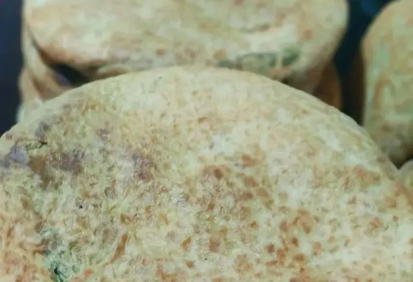 石子馍馍和团也有讲究,要加入纯碱、鸡蛋、菜籽油、苦豆粉。这苦豆粉是一种绿色植物,通过清洗晒干后,用手搓成的绿色粉末,用于烤馍之用。