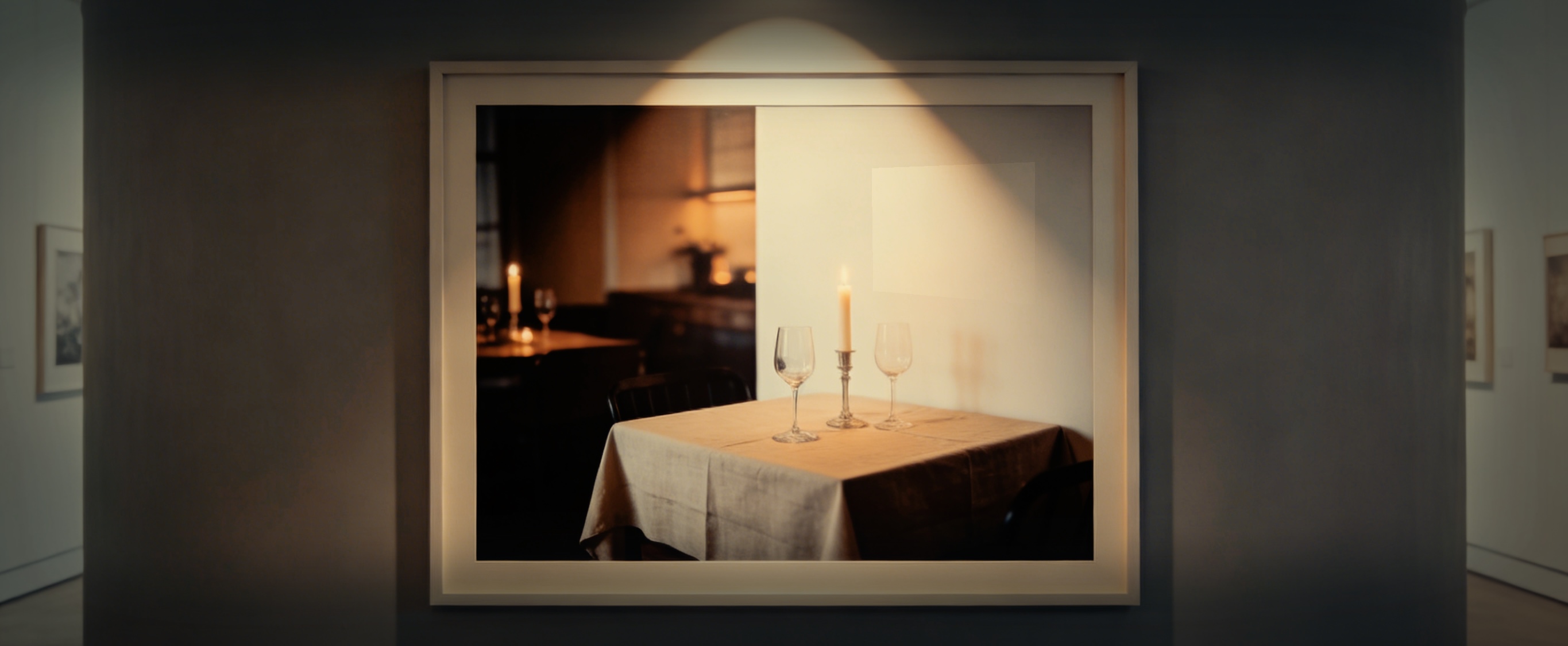 林砚:(混响)空的衣架,单人餐具,半边皱褶的床。最后那幅“撕掉合影的墙”,被单独挂在弧形墙面上,射灯的角度让那片空白几乎在发光。