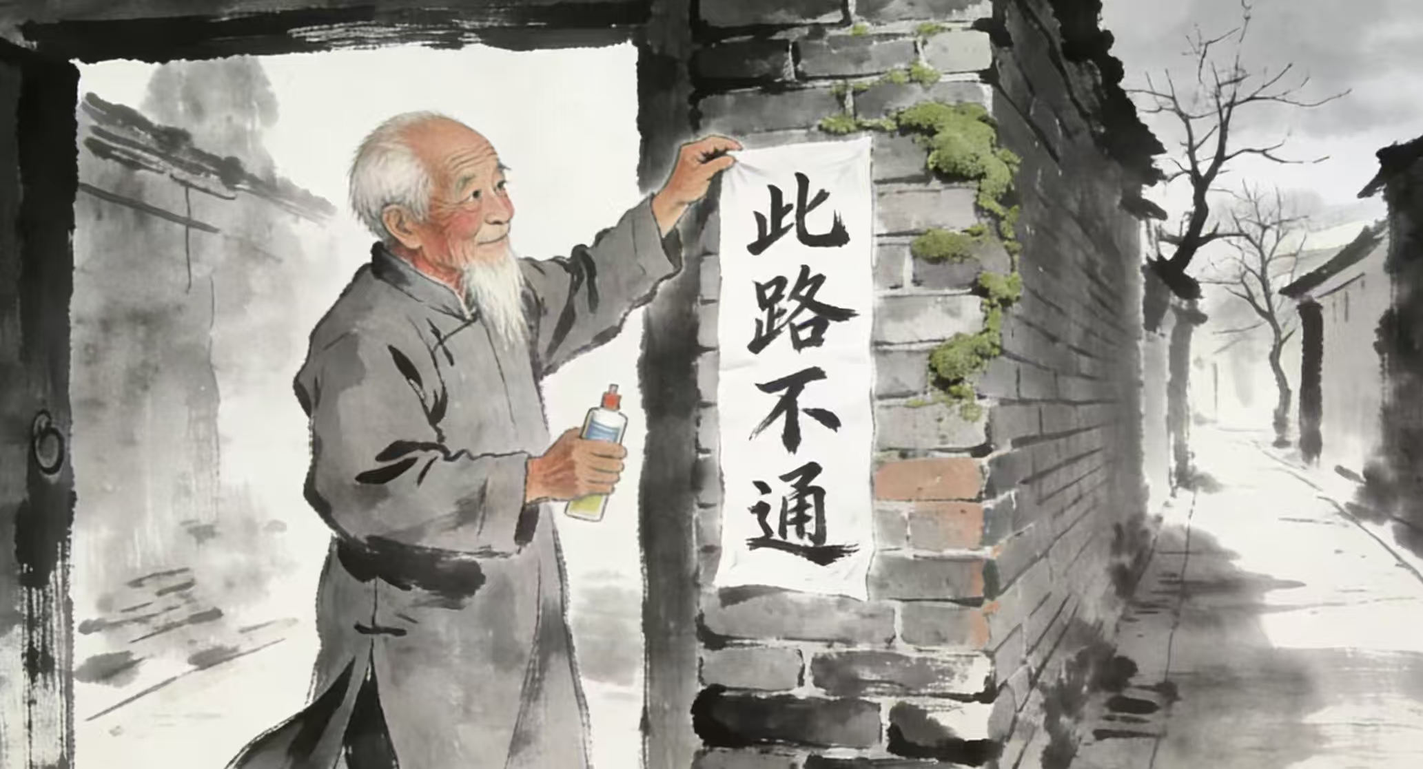 他走出来时,面无懊丧,而是目光闪闪,似在思索,然后站在胡同口,向左右两边光秃秃的墙壁望了望,跟着蹲下身,打开那布包,包里面有铜墨盒、毛笔、书纸和一个圆圆的带盖的小饭盆。他取笔展纸,写了端端正正、清清楚楚四个大字:此路不通。又从小盆里捏出几颗饭粒,代作浆糊,把这张纸贴在胡同口的墙壁上,看了两眼便飘然而去。