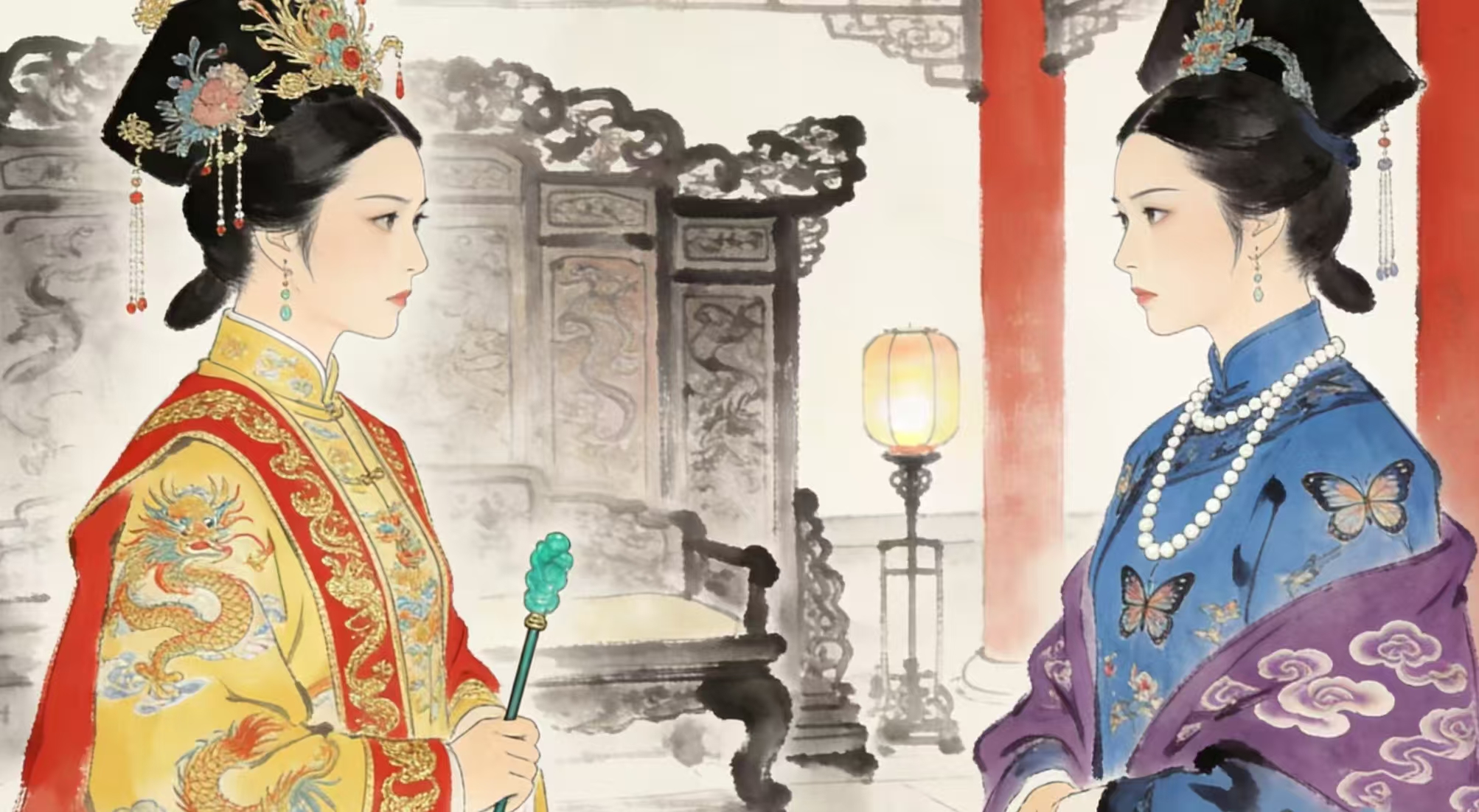 纯贵妃孤独地坐在旧椅上,天渐渐黑了,她的身影渐渐被黑暗吞没,直到吱呀一声,房门开了,一道光线穿过门缝,落在她脸上。