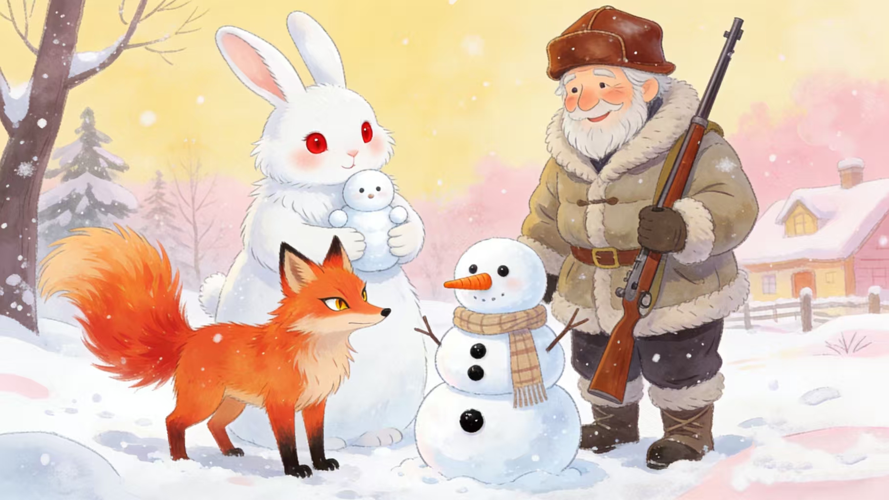 “嗬呦!啪!”一个胡子拉碴的猎人叫嚷着,鞭子挥得呼呼响,雪花卷起像飓风,“这是谁家的孩子呀?”猎人惊讶地看着小雪子,一只大手把她从雪窝里拎了起来。