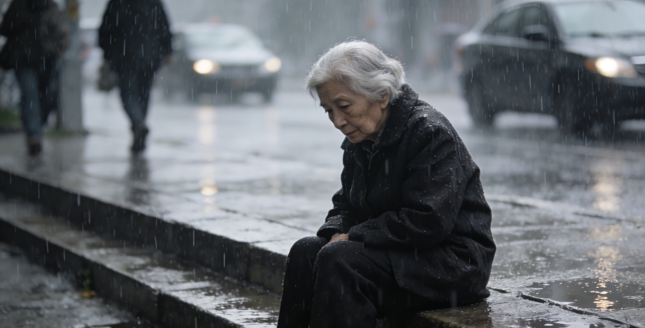 路人:婆婆,下雨了,您怎么一个人坐在这啊,我扶您去那边避雨吧
