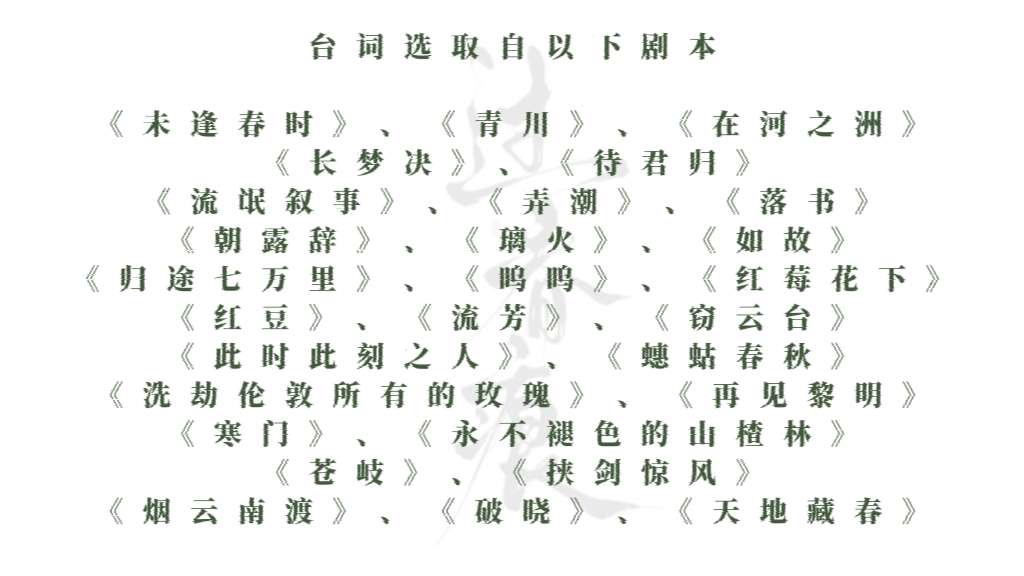朱懿辰:(混响)一愿吾妻平顺, 二愿将军魂安,三愿岁岁无虞,四愿百事从欢。 最后一愿!愿上天垂怜,莫将吾妻困在天瑞二十九年的春天! ——《窃云台》