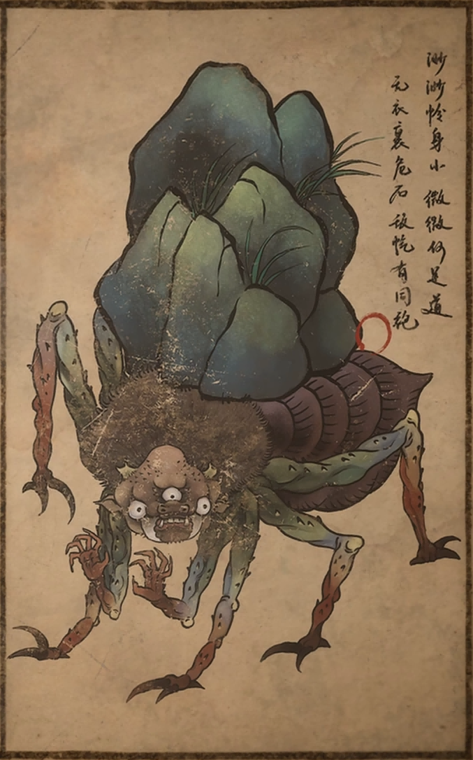 茶刚入肚,汉子立时痛苦难当,翻倒在地。郎君再去看那老汉,但见他转身一旋,现出原形,乃是只驼背杵杖的大虫子,身上缠着许多丝线。顺着丝线往上看去,有只大蜘蛛正趴在屋角,提着丝线,引着大虫子敲击拐杖,发出“铮铮”的声响。地上的石块闻得此声,伸出腿足,变成一个个小石蛛。它们朝着汉子喷出蛛丝,要将其捆住。那俊秀郎君见到这般景象,来不及管他那正在求救的兄长,拔腿就逃走了。