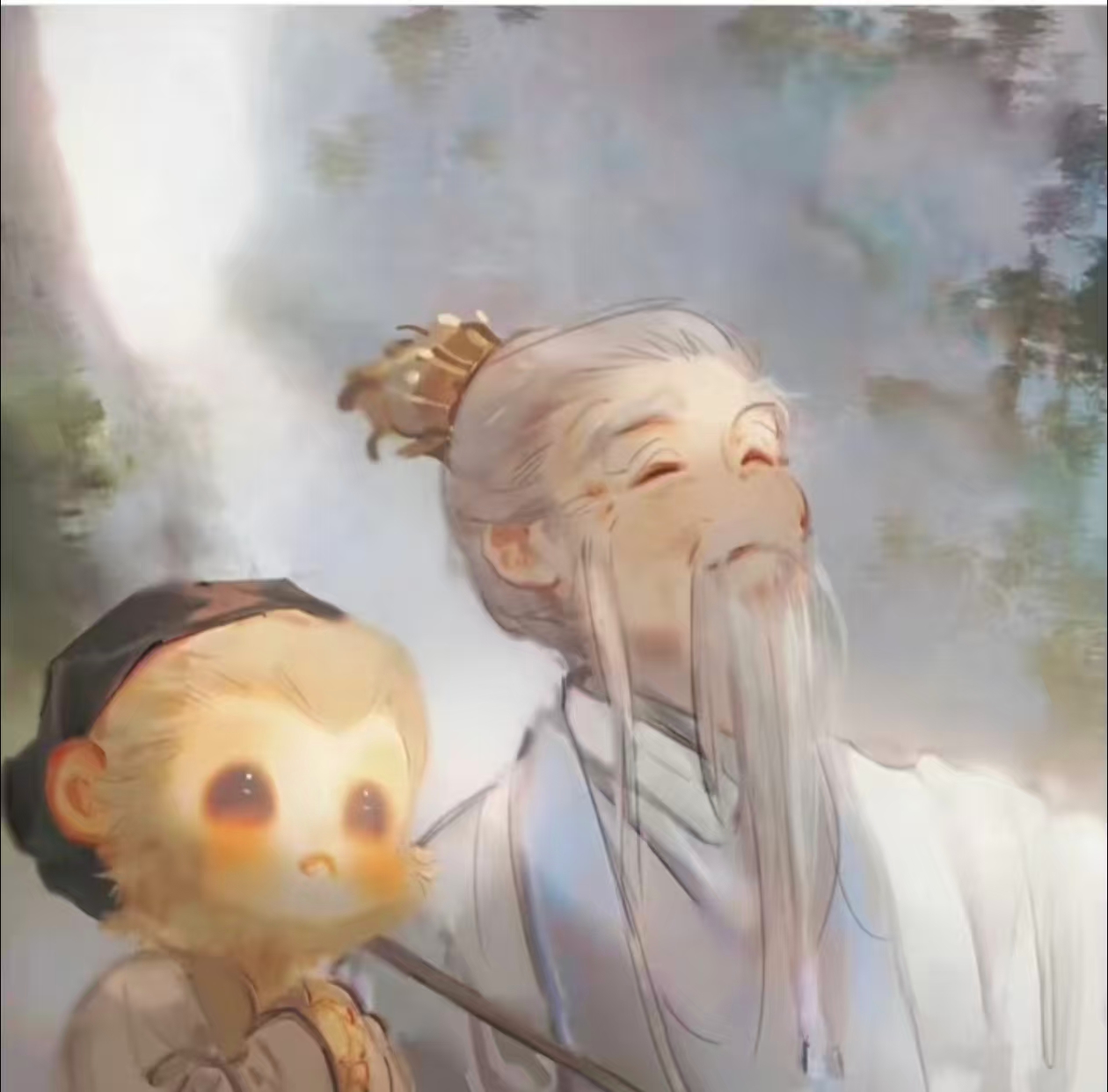 【忽然,山风止息,万籁俱寂。一株枯桃竟悄然抽芽,嫩绿如泪。雾中缓步走出一位老僧,布衣芒鞋,手持拂尘,眉目慈和——正是菩提祖师化身,形如樵夫,却自带清光。】