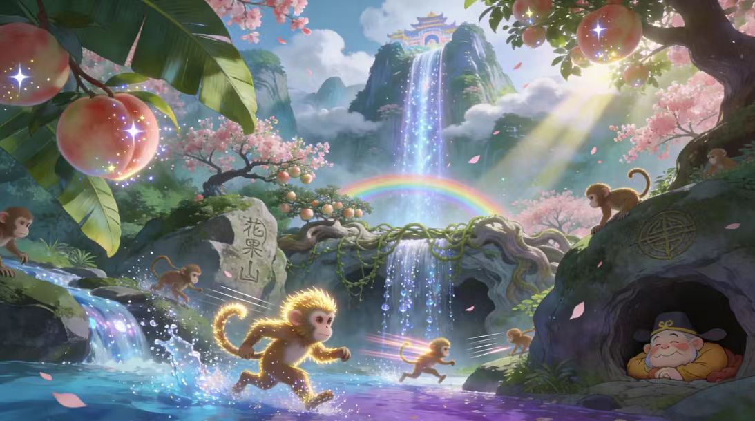 【花果山·水帘洞外: 群猴嬉戏,桃香四溢。忽见天边祥云翻涌,仙乐缥缈,一道 金光自九霄垂落。太白金星脚踏云霞,手持玉笏,含笑而立。】