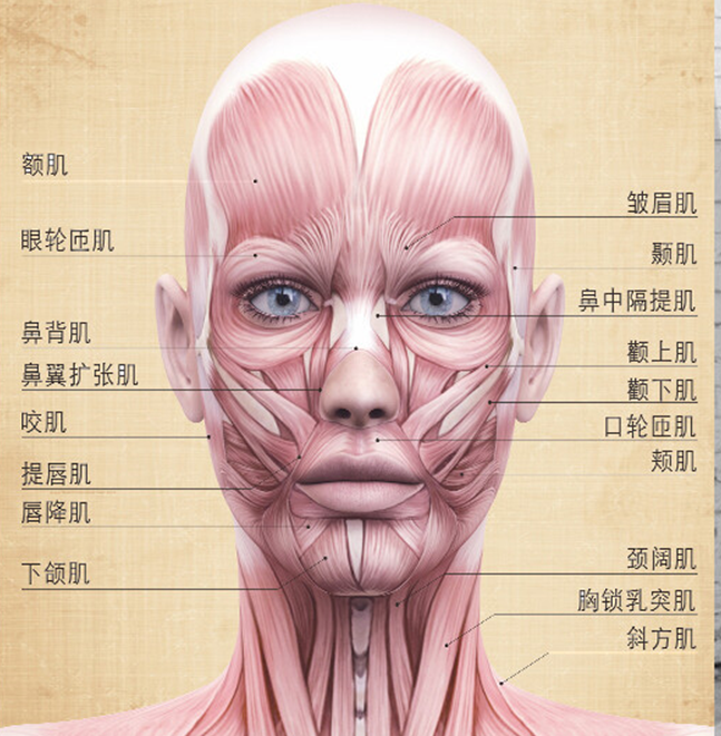 2、从上往下,依次按摩 额肌、眼轮匝肌、颧肌、鼻翼各10秒