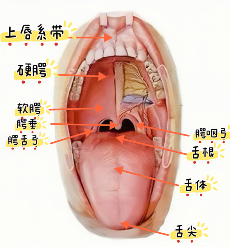 刮舌:舌尖抵住下齿背,舌体贴住上齿背,随着开口用上齿齿沿儿轻刮舌尖后部、舌叶和舌面,使舌面逐渐隆起。