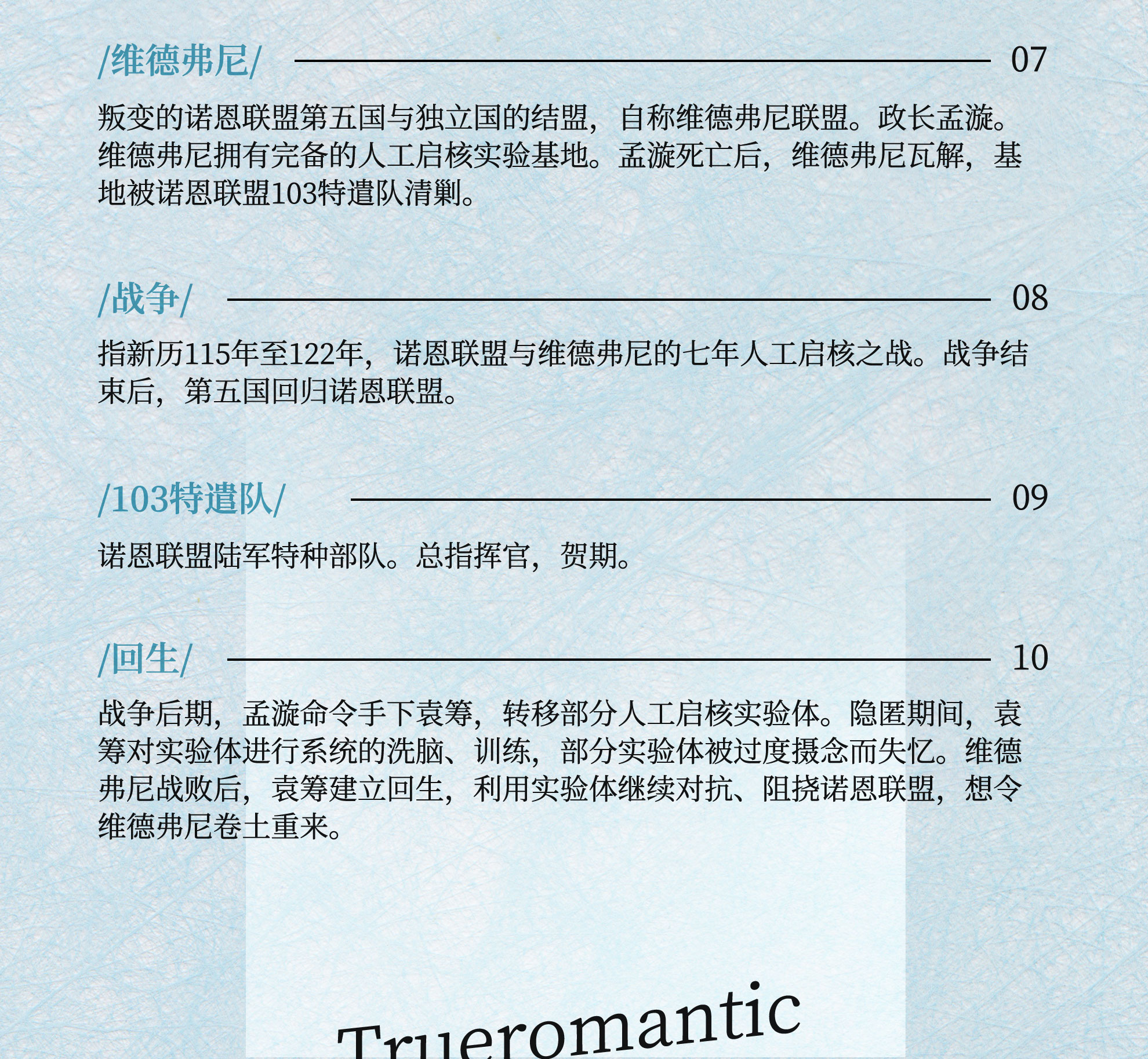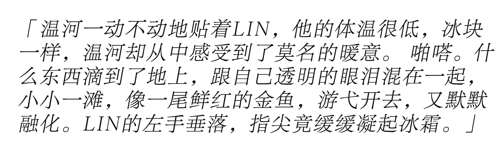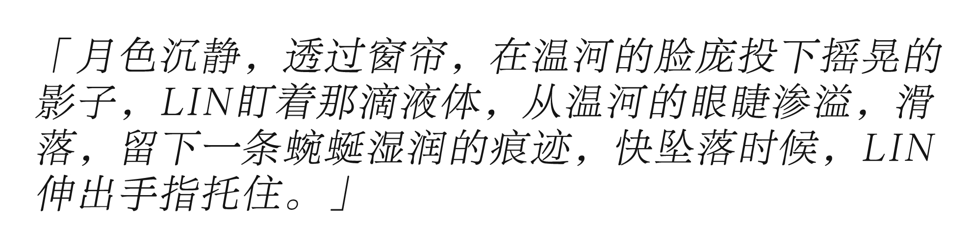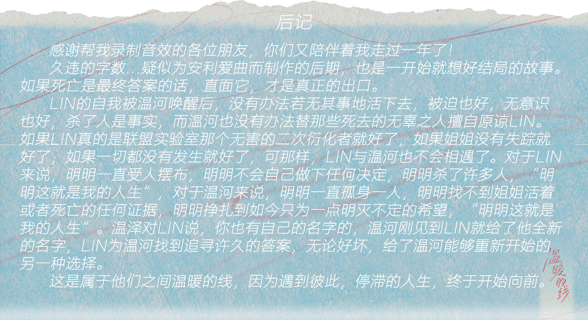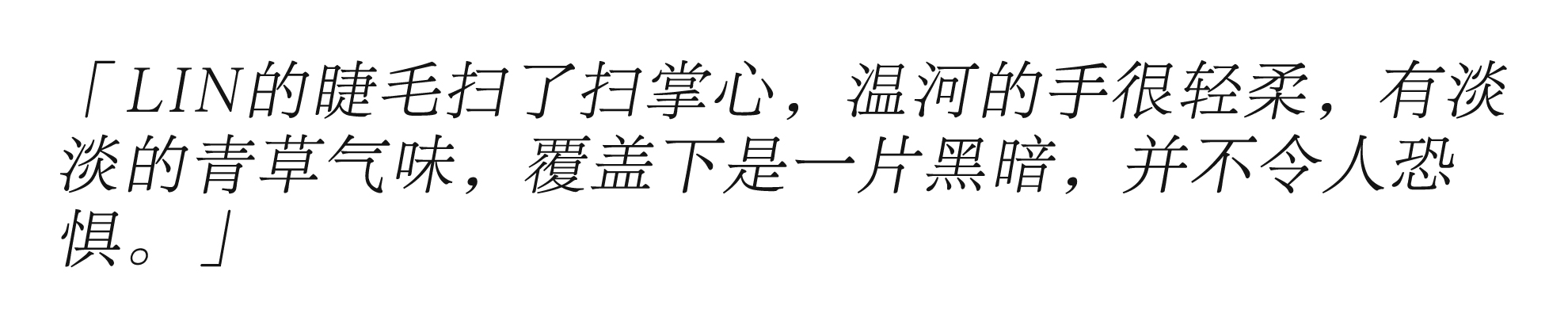 LIN:(os)记忆,告诉我要记住什么,逃避什么,让我变成了今天的我。我杀过很多人,我恬不知耻地接受了温河的善意,妄想像普通人一样留在他身边。明明迄今为止都手握鲜血,明明已经被训练到可以屏蔽一切感受。