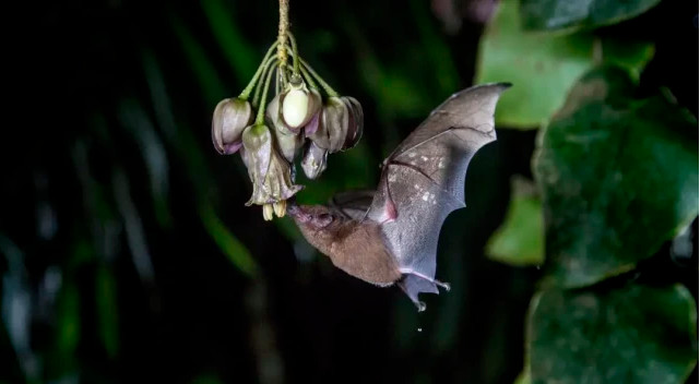 24. 这是灯蝠花,这种植物在夜间开花。花朵在下午六点钟左右绽放,每一朵花只能持续一个晚上。开放大约七个小时后,花朵就会凋谢。但在开花的这段时间里,一种特殊的动物会前来觅食——科氏长舌蝠。在灯蝠花的花期中,科氏长舌蝠几乎只以它的花蜜为食,它是灯蝠花的主要传粉者。在这种关系中,双方似乎是平等的,实际并非如此。科氏长舌蝠喜欢这种花蜜,因为它很可口,但它的营养价值并不高。这只科氏长舌蝠每晚需要造访数百朵灯蝠花,它在进食的同时,可以完成传粉工作。