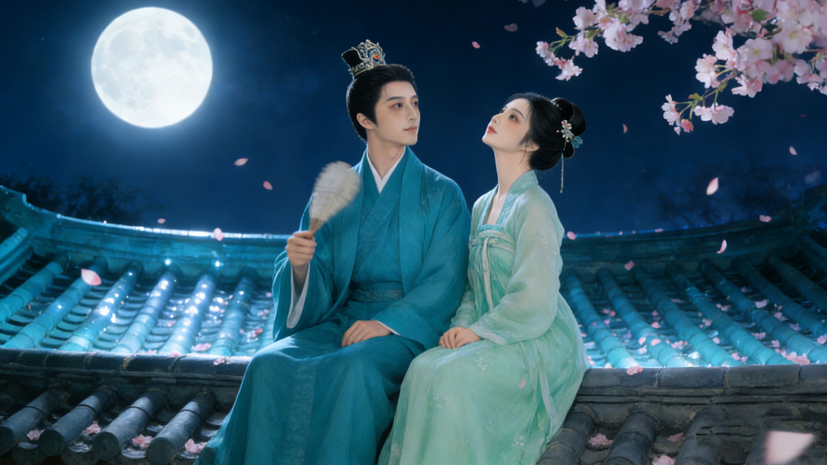 月光下,两人相拥相依,海棠花瓣随风落在他们发间肩头,静谧又温柔