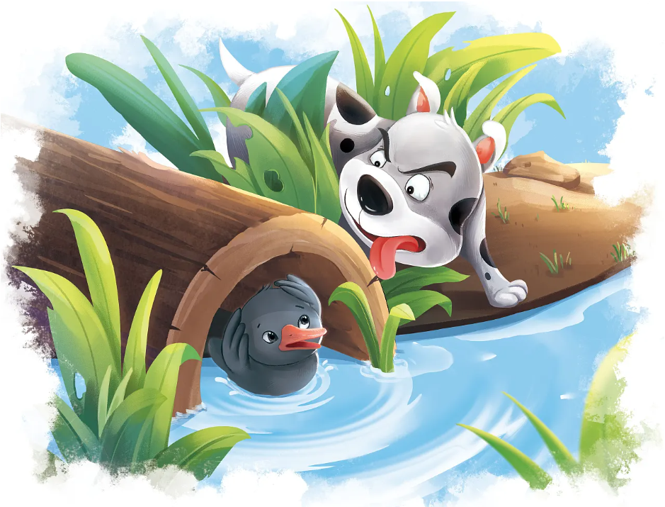 However, the dog just glanced at the ugly duckling, didn't bite him, and walked away.