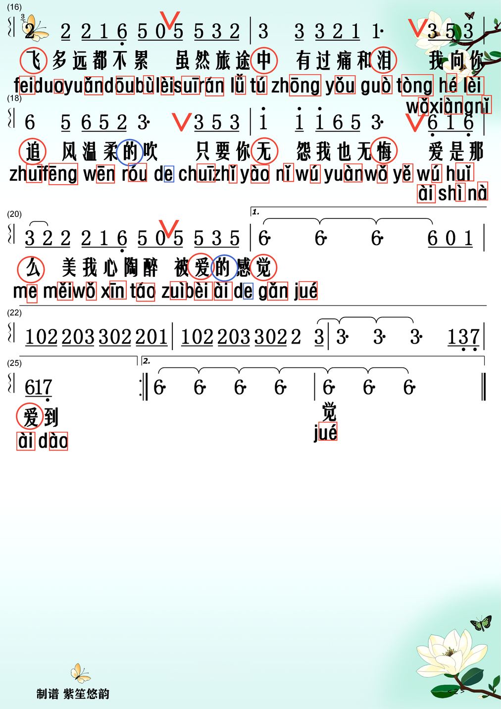 高音与颤音:副歌首句“我向你飞”需用气息支撑高音,加入轻微颤音增强感染力。