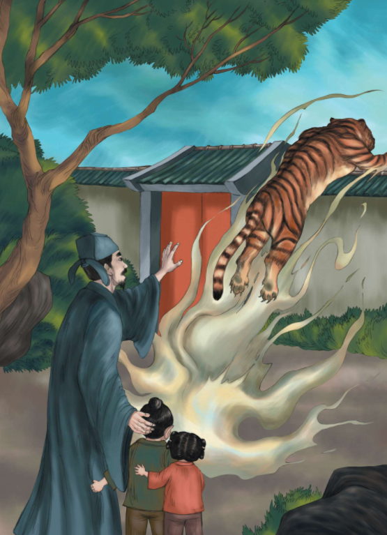 21. 候员见此情景,不得不到后院堂屋里拿出那张虎皮递给妻子。妻子一把抢过虎皮,双眼瞬间电光爆射,张开嘴巴发出一声震耳欲聋的虎啸,随即披上虎皮,几个跳跃后,脚下生风,化作一只猛虎,仰天咆哮,瞬间消失在山林中。候员与孩子们惊诧不已,和尚更是胆战心惊,半晌,回过神来,候员心知与妻子缘分已尽,只好怏怏不乐地带着孩子们离开了。