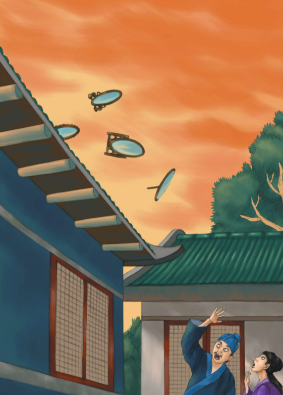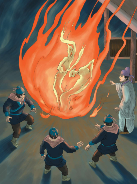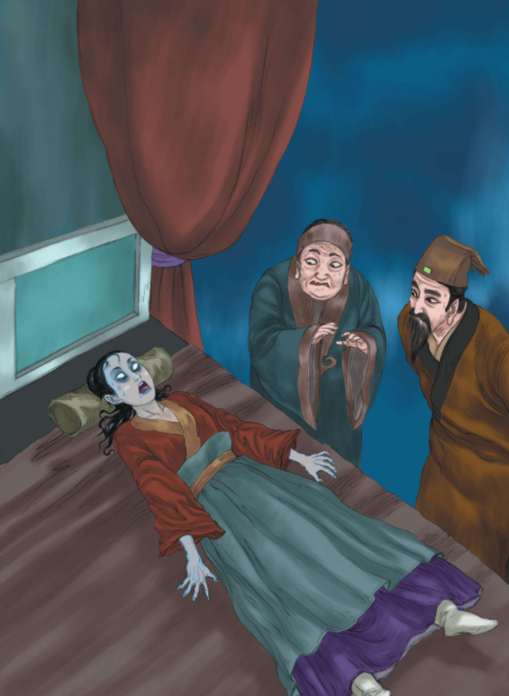 34. 胡人叫人点燃一堆篝火,边诵经边在两人周身比划,一声令下,将捆着的两人投进火中。令史担心烧死妻子,扑上去要去救人,胡人拦住他说:“保证还你一个原来的妻子。”只见火中的主仆二人扭曲挣扎,口中发出凄厉的鸟叫声,声嘶力竭,过了好一会,渐渐没了声音。胡人让众人撤下火炭,令史看见妻子和女仆好端端地躺在地上,身上没一点烧伤痕迹,然而就在两人身边却有两只像鸟一样的焦黑尸体,原来是两只苍鹄。胡人说妻子和女仆被鹄妖上了身,刚才烧的只是鹄妖,人是不会受伤的。醒来后,令史询问妻子和女仆,他们竟也不记得曾经骑马出去过,其他一切如往常一样。