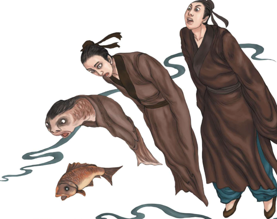 53. 官吏将张纵带到一条河边,只觉被人推了一下便掉进水里,随后就变成了一条小鱼。起初小鱼只有一寸长,每天见长,到第七天时已经长大两尺多长的大鱼了。变成鱼的张纵头脑十分清醒,他辨认出自己正在家乡的一条河里。忽然一张网迎头撒下,还没来得及挣扎就被渔人捕获了。本地王家来买鱼,将变成鱼的张纵买走了。张纵被人提着进了王家院子,他看见王夫人正对着镜子梳头,看过后就吩咐厨子杀鱼。